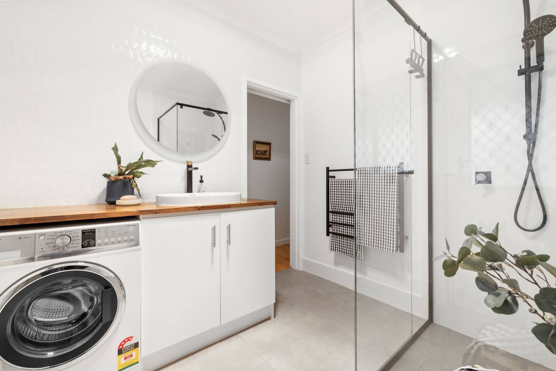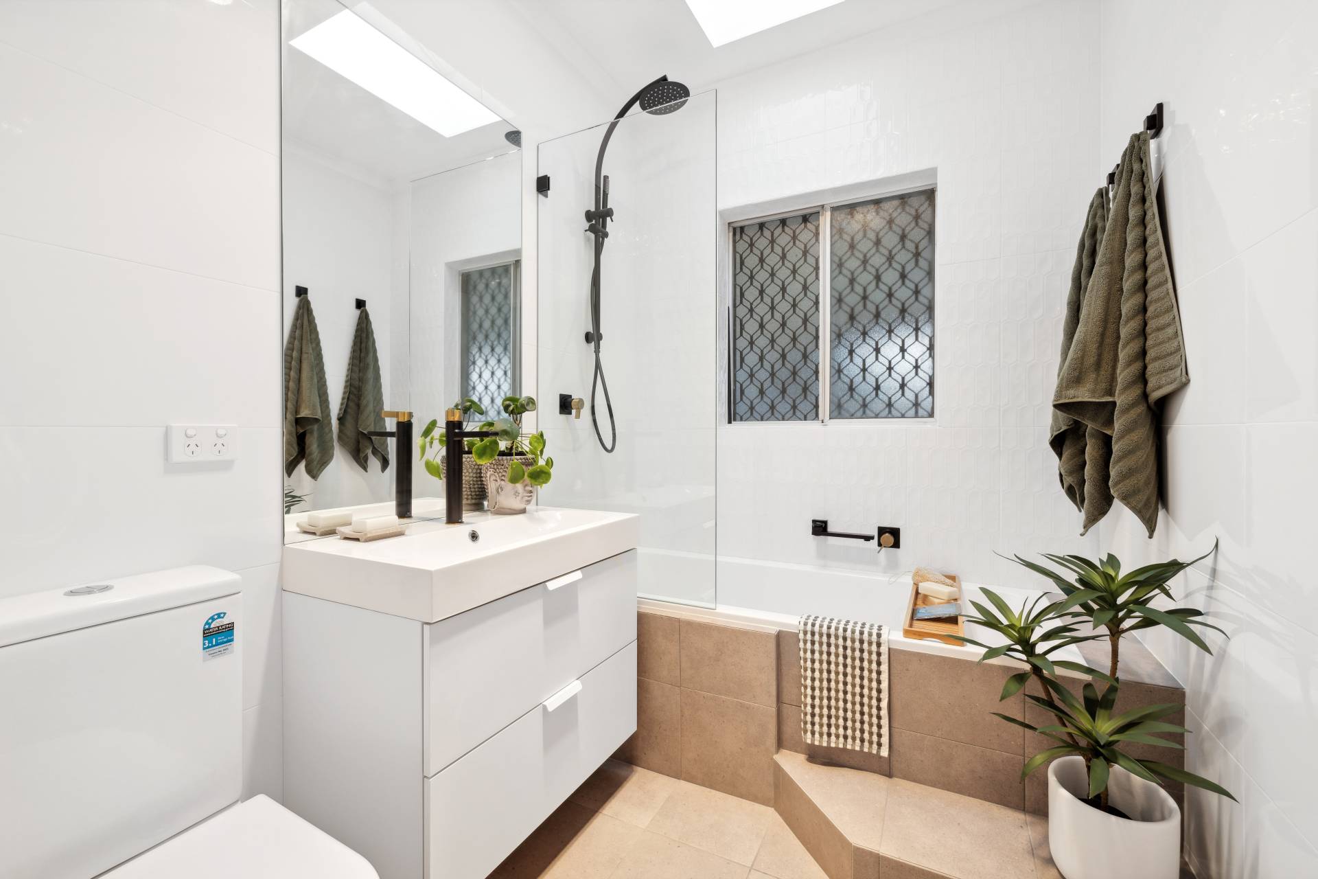 Dorf black & brass accent tapware is the perfect choice for the two bathrooms, the main with a Velux window above the bath and a clever renovation sees the laundry combining with the second bathroom, complete with heated towel rail and separate toilet.
