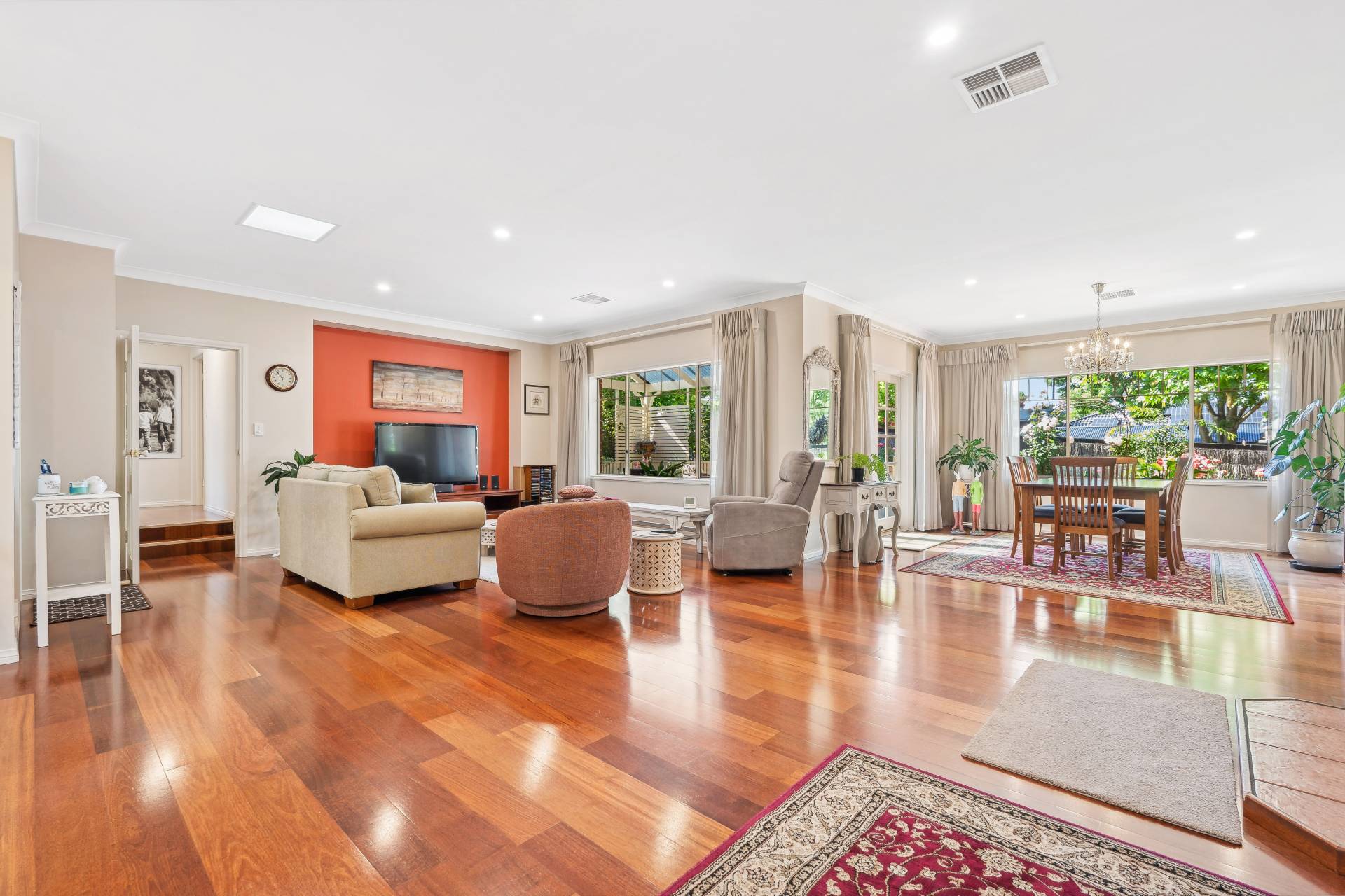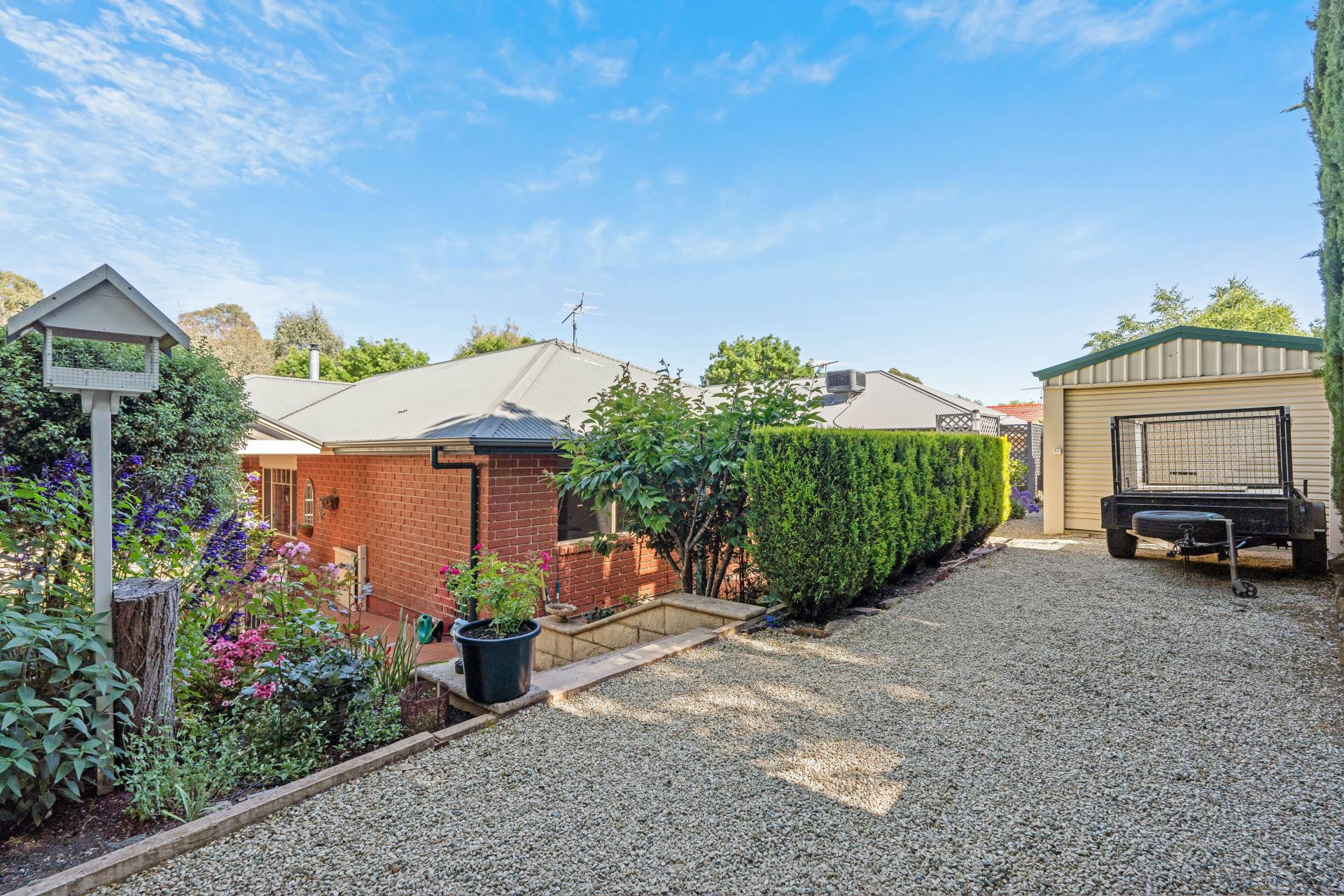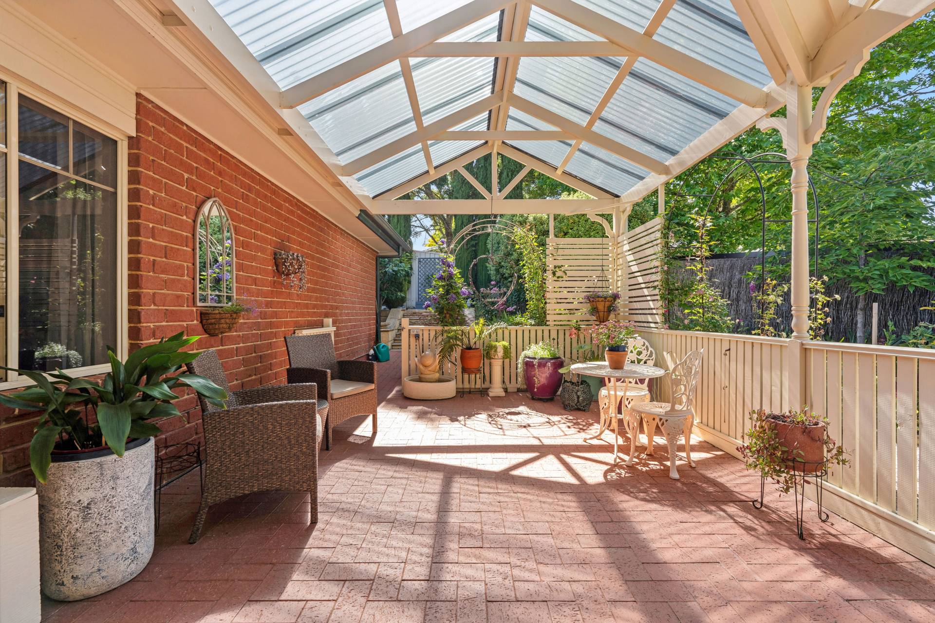 The open plan living, dining and kitchen has polished solid timber floors and captures leafy views through many windows. French doors lead out to an undercover entertaining area, that then traverses through so many pretty garden beds and up to a 6m x 3m shed that has concrete floor, its' own fuse box and dedicated side access from the street.
