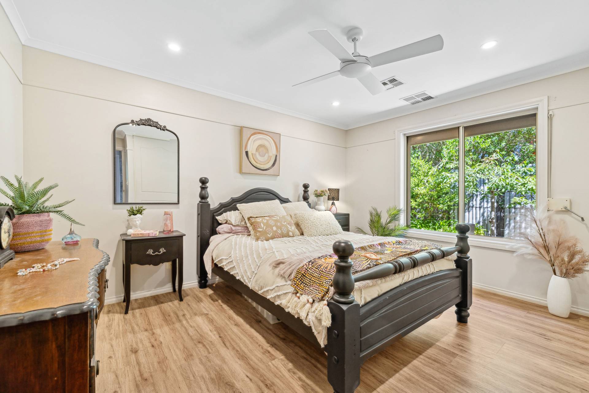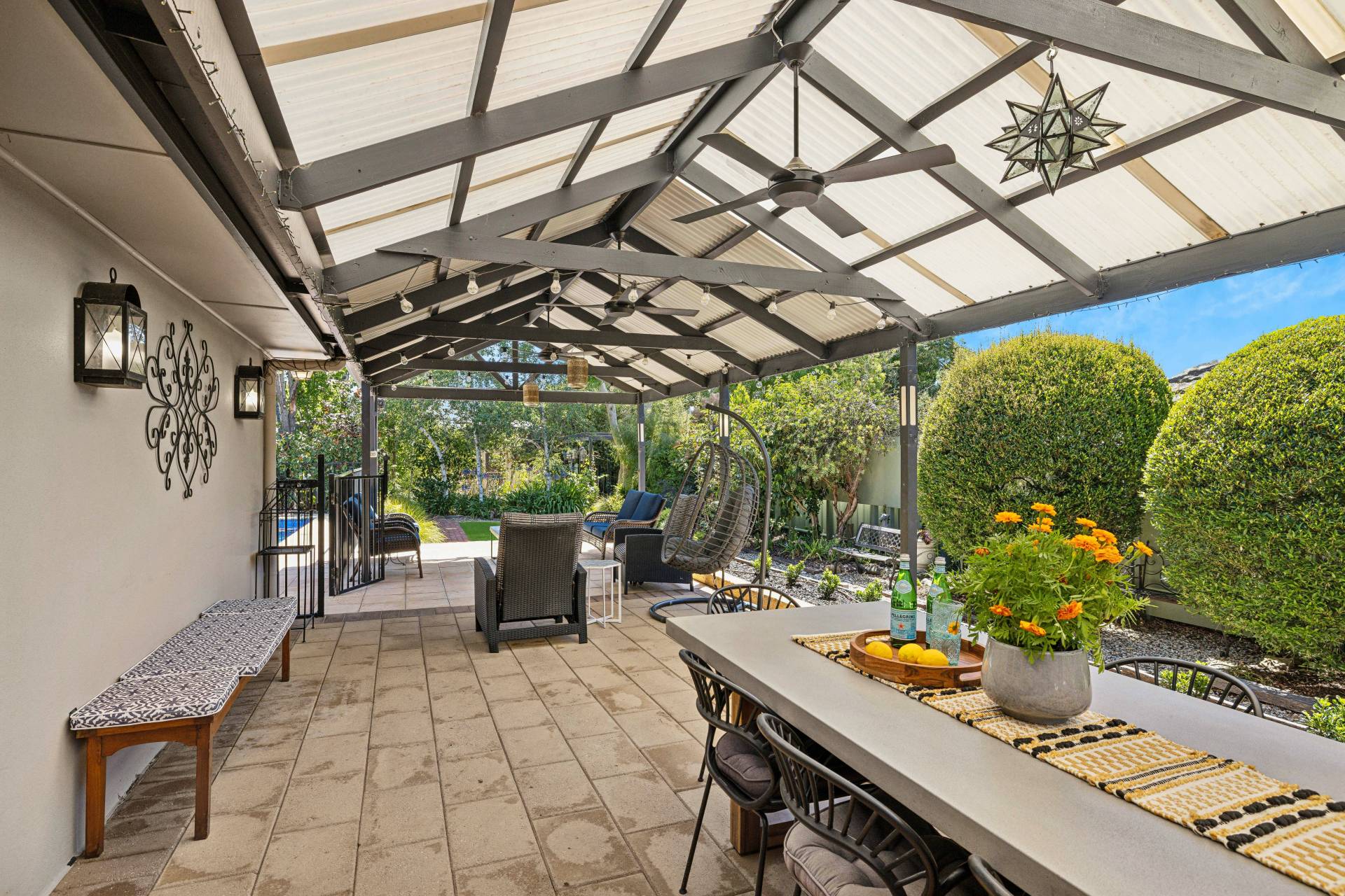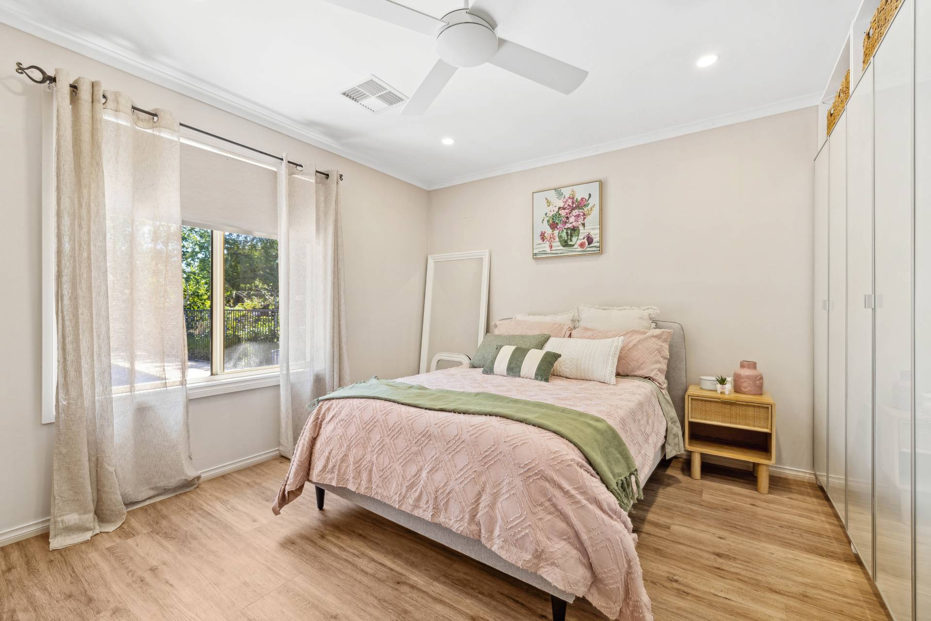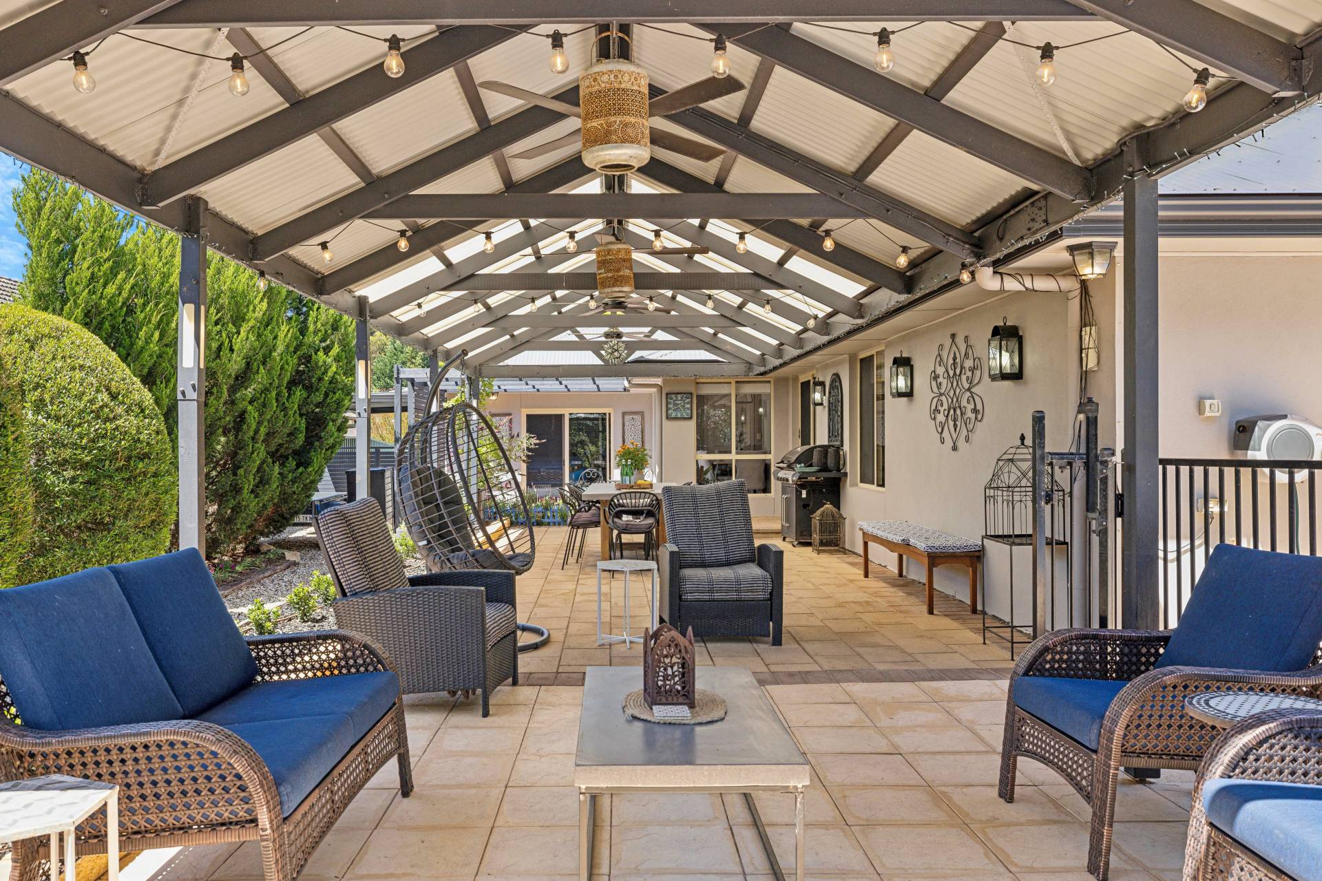 Alongside, in the meals area, the large windows capture a cottage garden theme sitting area with water fountain and from the large living room, slide the doors to one side and head out into a huge undercover entertaining area with ceiling fans and feature lights.