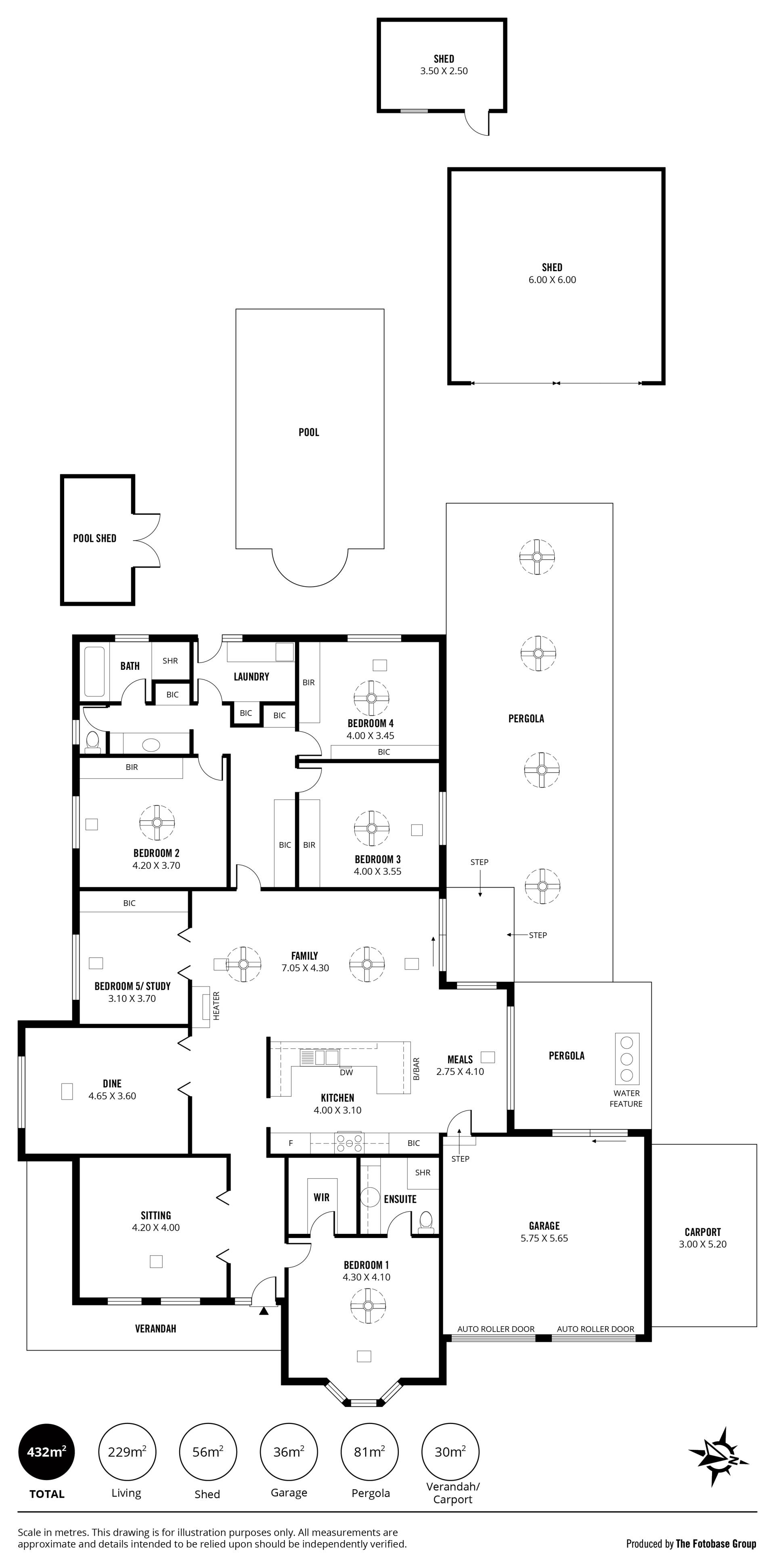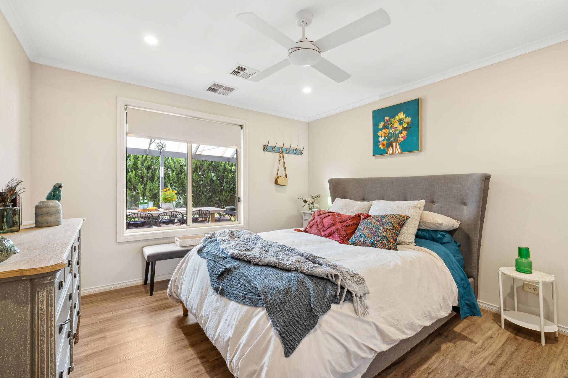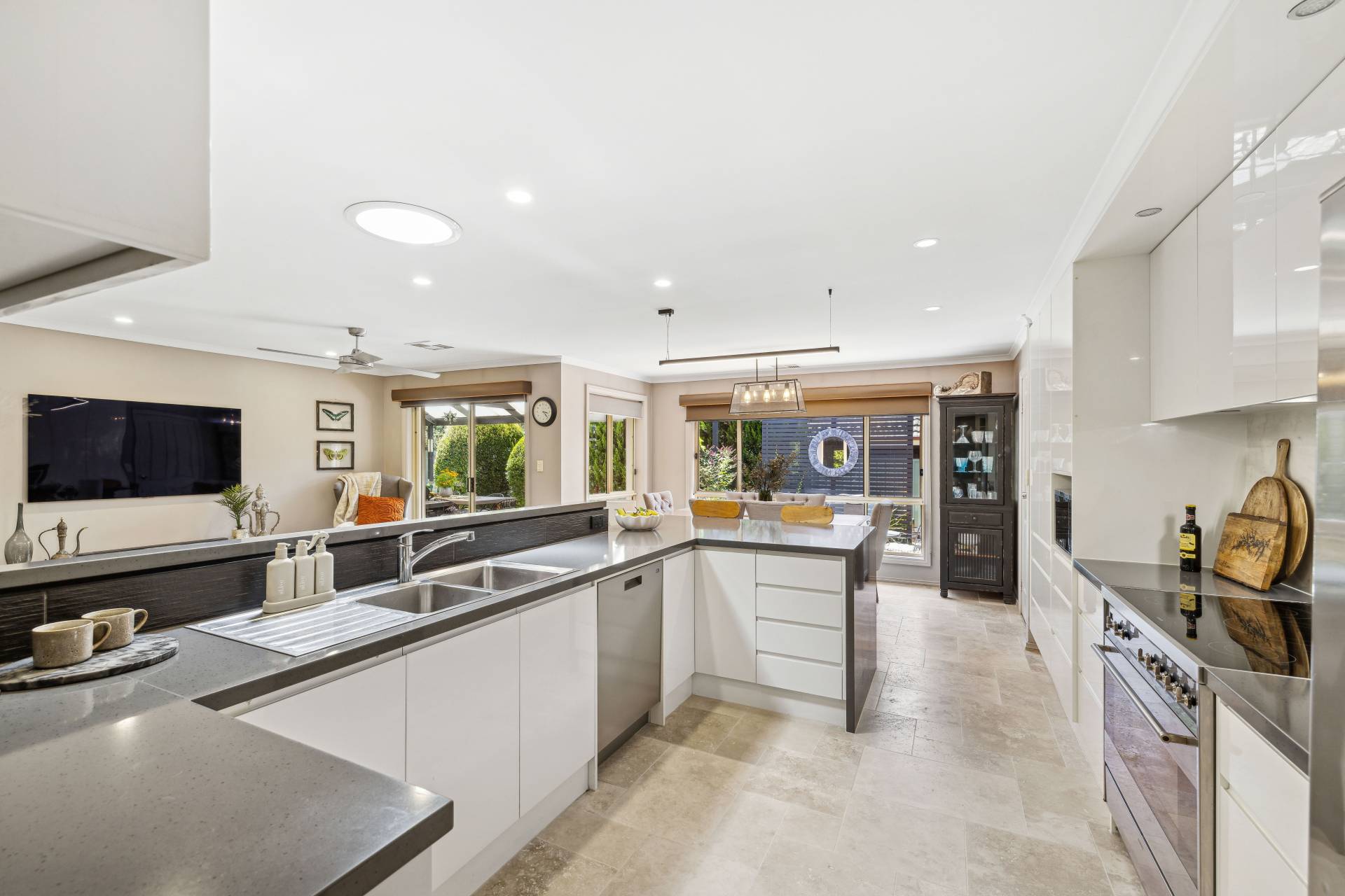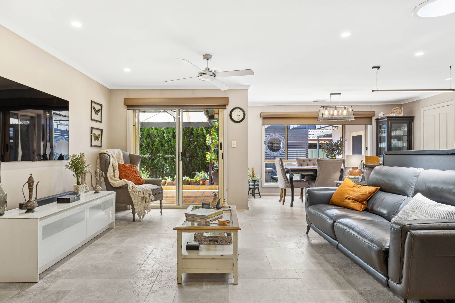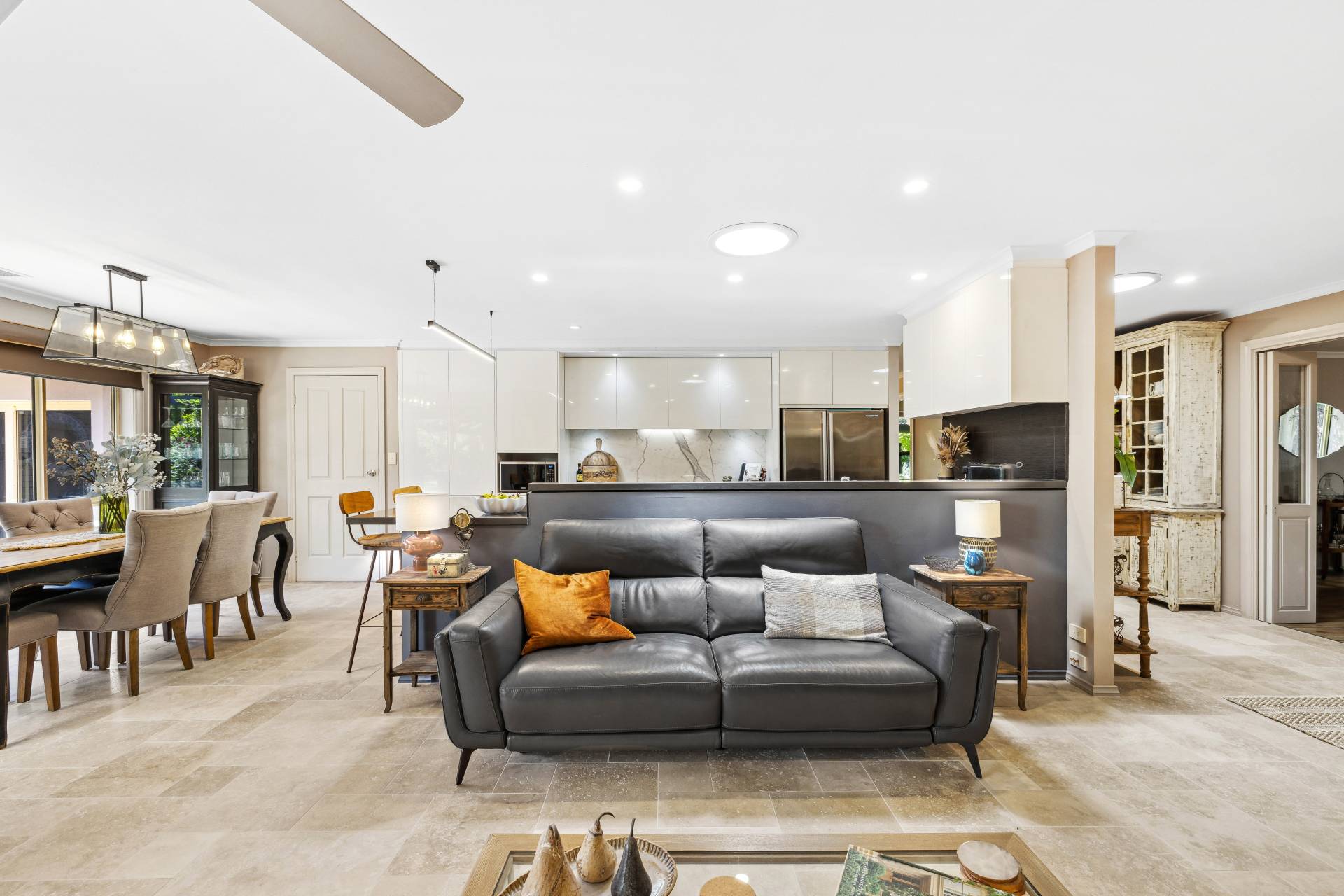 Alongside, in the meals area, the large windows capture a cottage garden theme sitting area with water fountain and from the large living room, slide the doors to one side and head out into a huge undercover entertaining area with ceiling fans and feature lights.