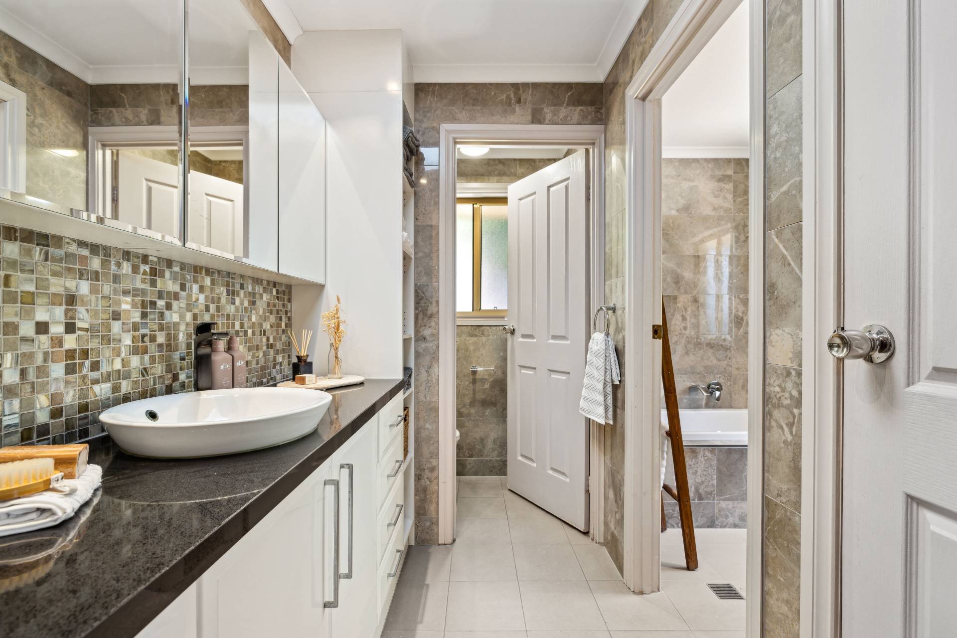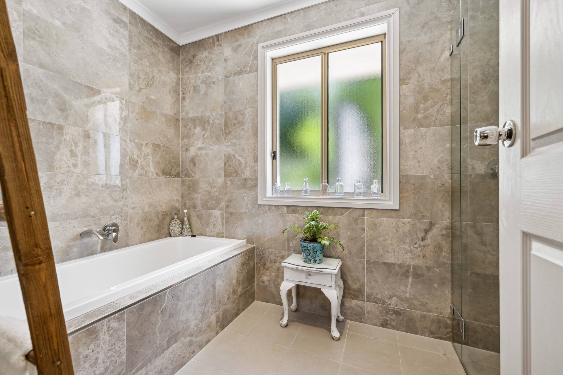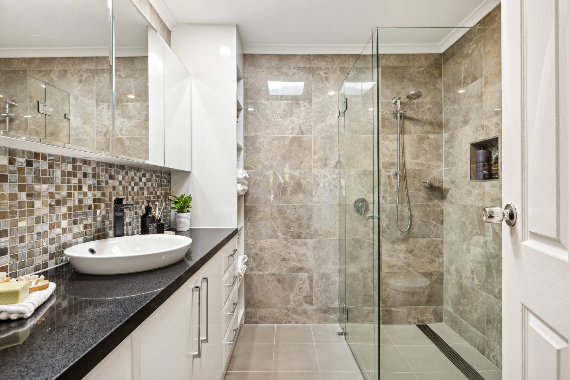 Both bathrooms and laundry have floor to ceiling tiles, stone benchtops and offer lovely details such as mirrored storage, shower niches, a skylight and deep bath.