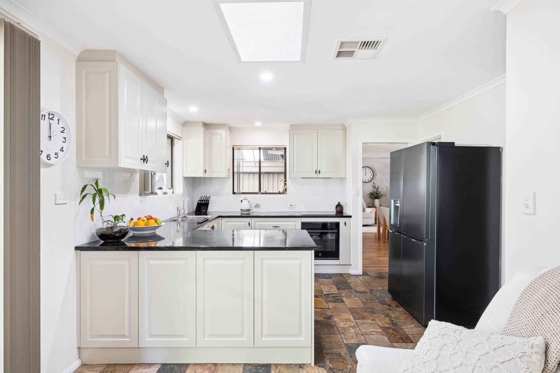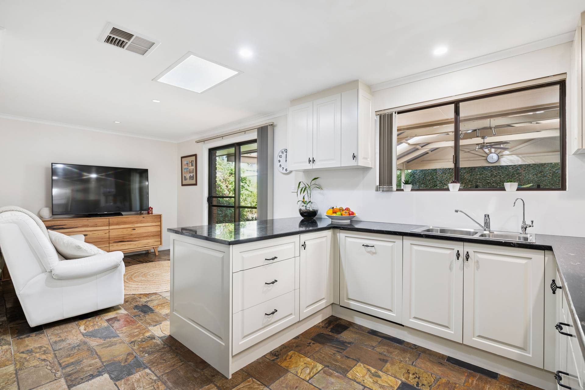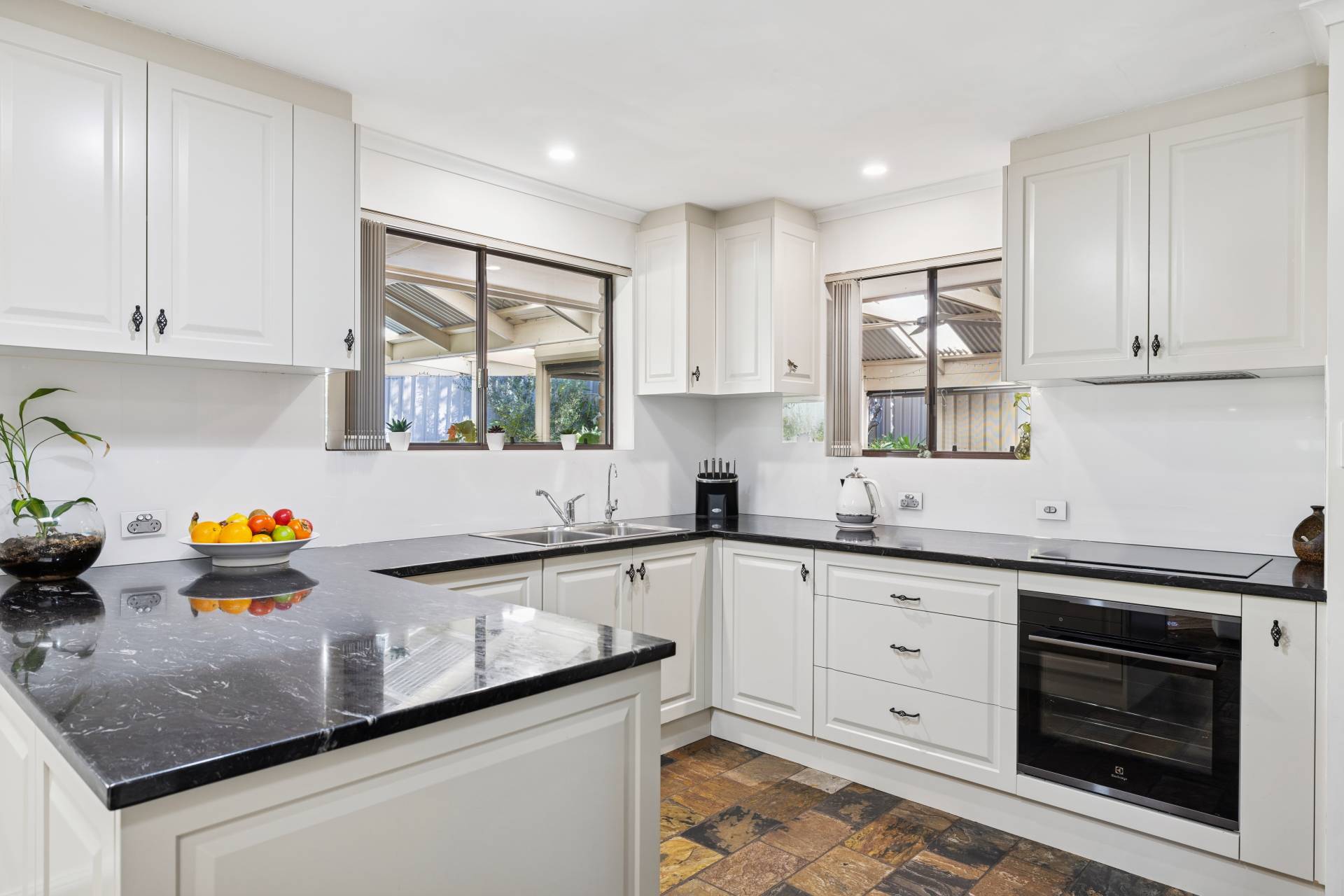 Stone tops adorn the kitchen benches and the walk-in pantry is more than generous to house all the ingredients for entertaining evenings.
