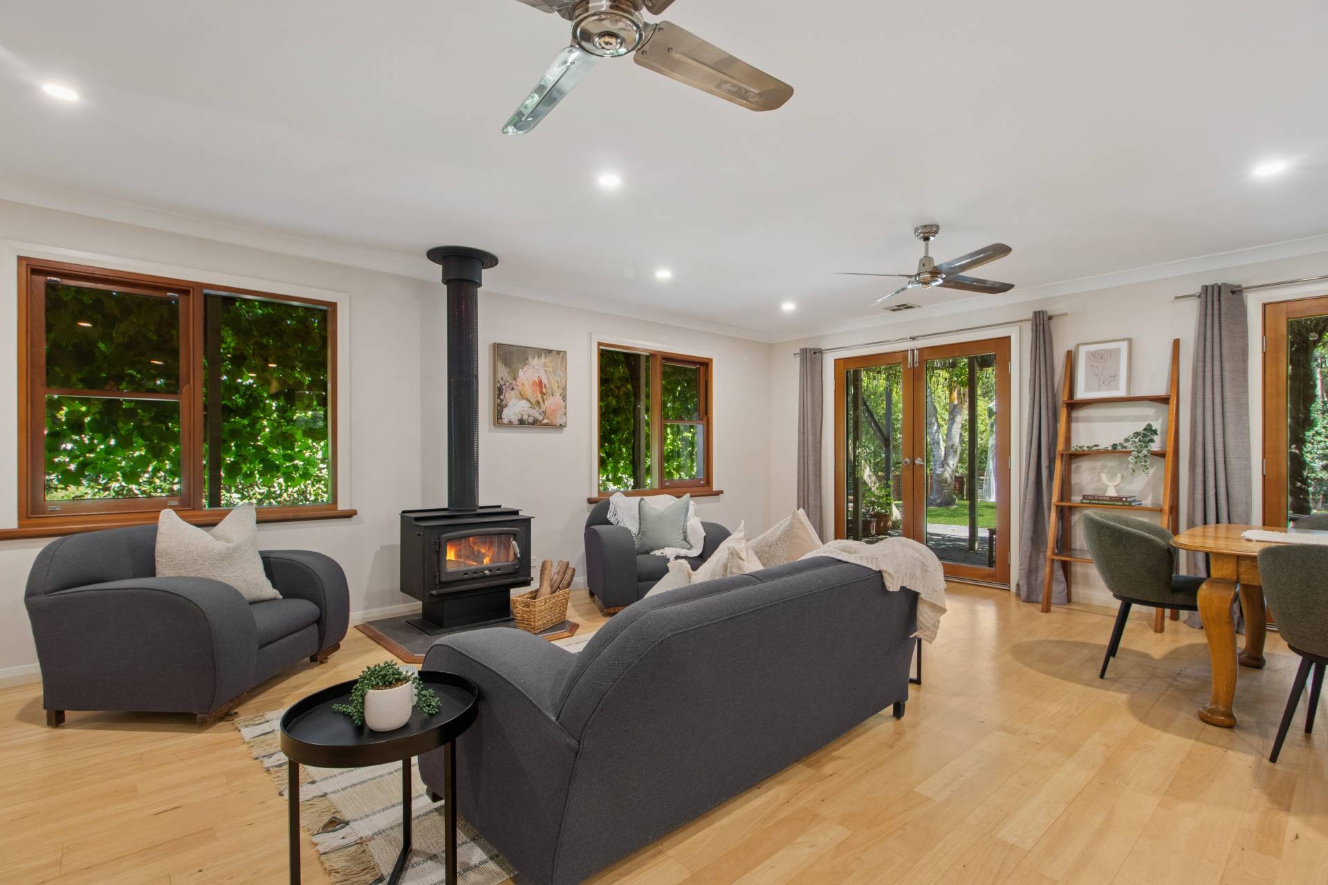 The heart of the home is where we find the warm, light filled open plan kitchen, dining and living zone, where French doors open to the garden for effortless entertaining and everyday enjoyment. The kitchen is a true conversation piece, featuring a mix of stone and timber benchtops - the timber lovingly hand crafted from a 300 year old tree that once grew just down the road. A Smeg freestanding oven and cooktop and Meile dishwasher complete the space, while under stair storage has been cleverly transformed into a temperature controlled wine cellar.