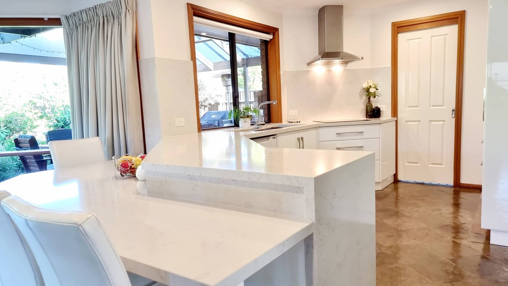 The kitchen with bright Silestone benches, hidden storage solutions and AEG appliances is more than enough to please the fussiest of food creators. Additionally, a very practical lower bench is perfect for casual meals or a homework station (no stools either; the comfort of a chair) or the perfect place to present a smorgasbord of delights when entertaining.