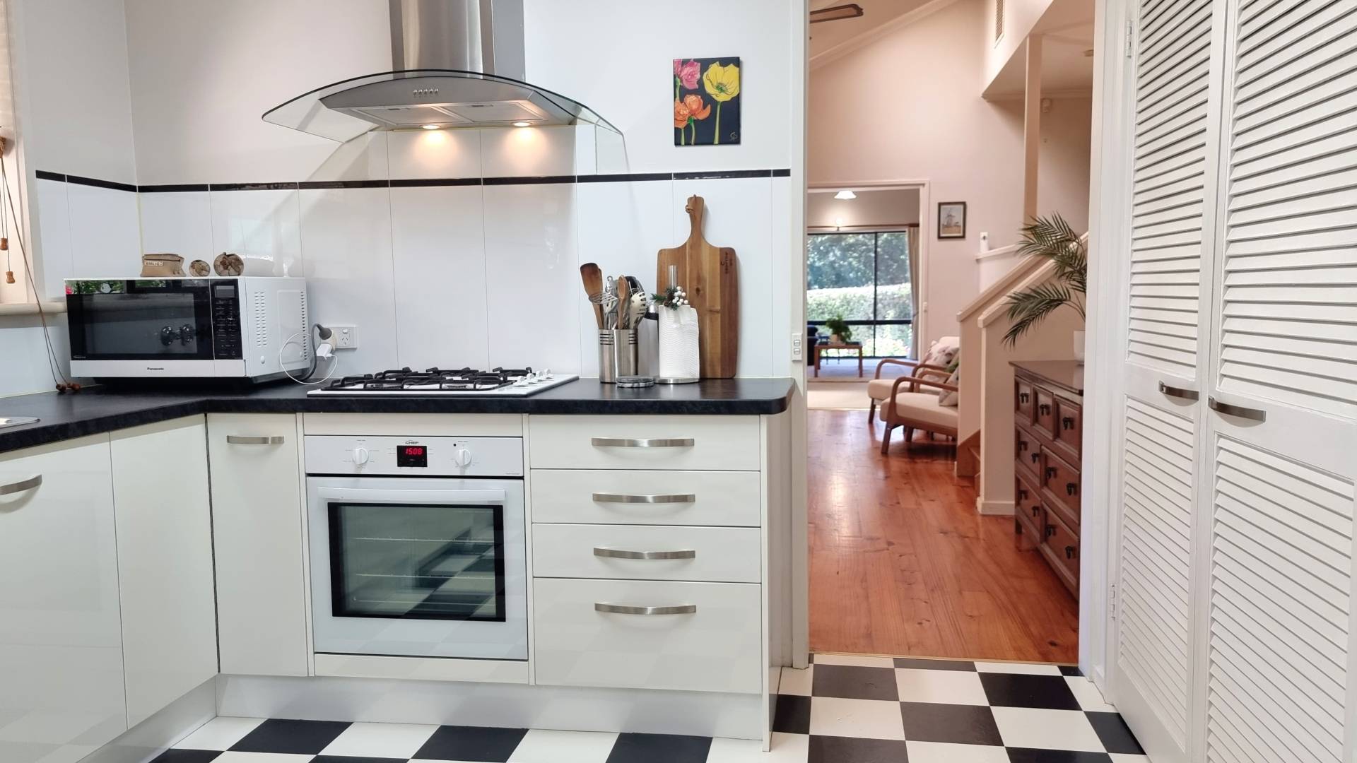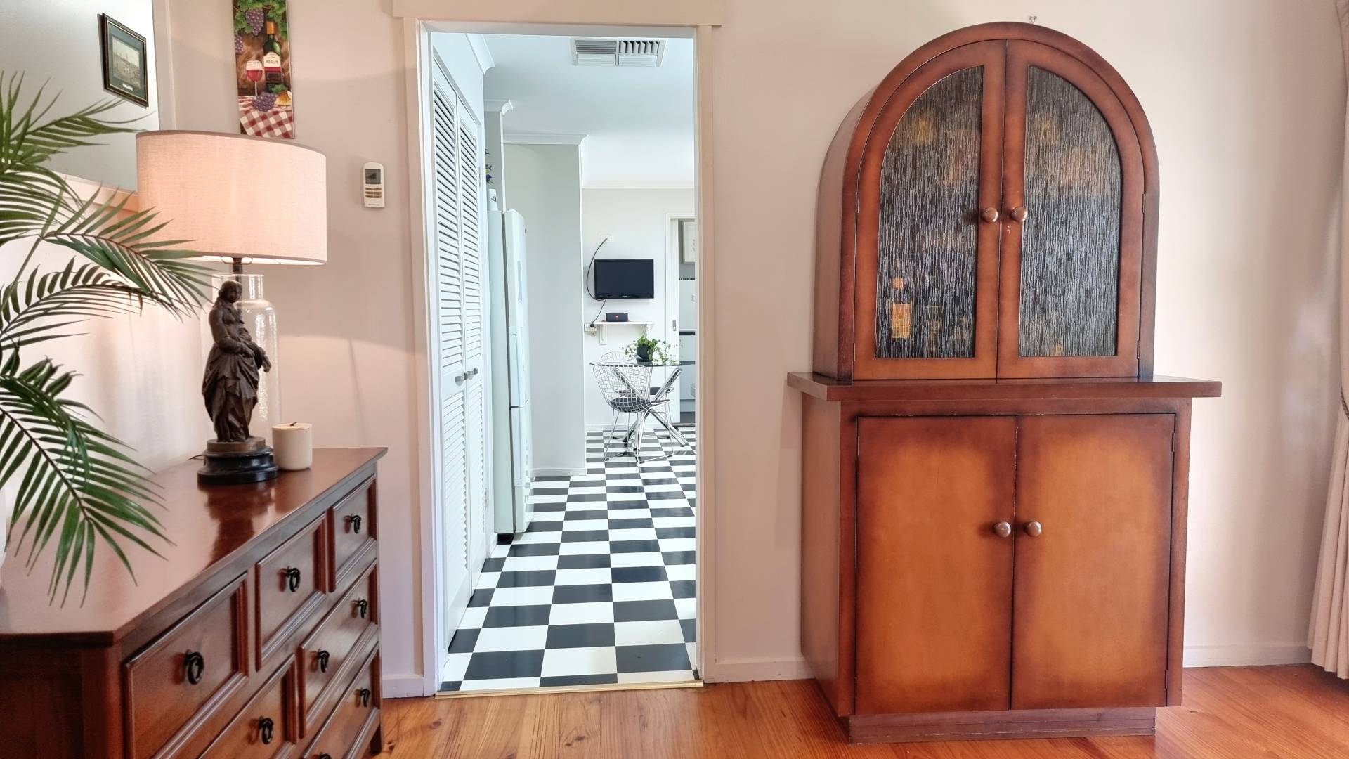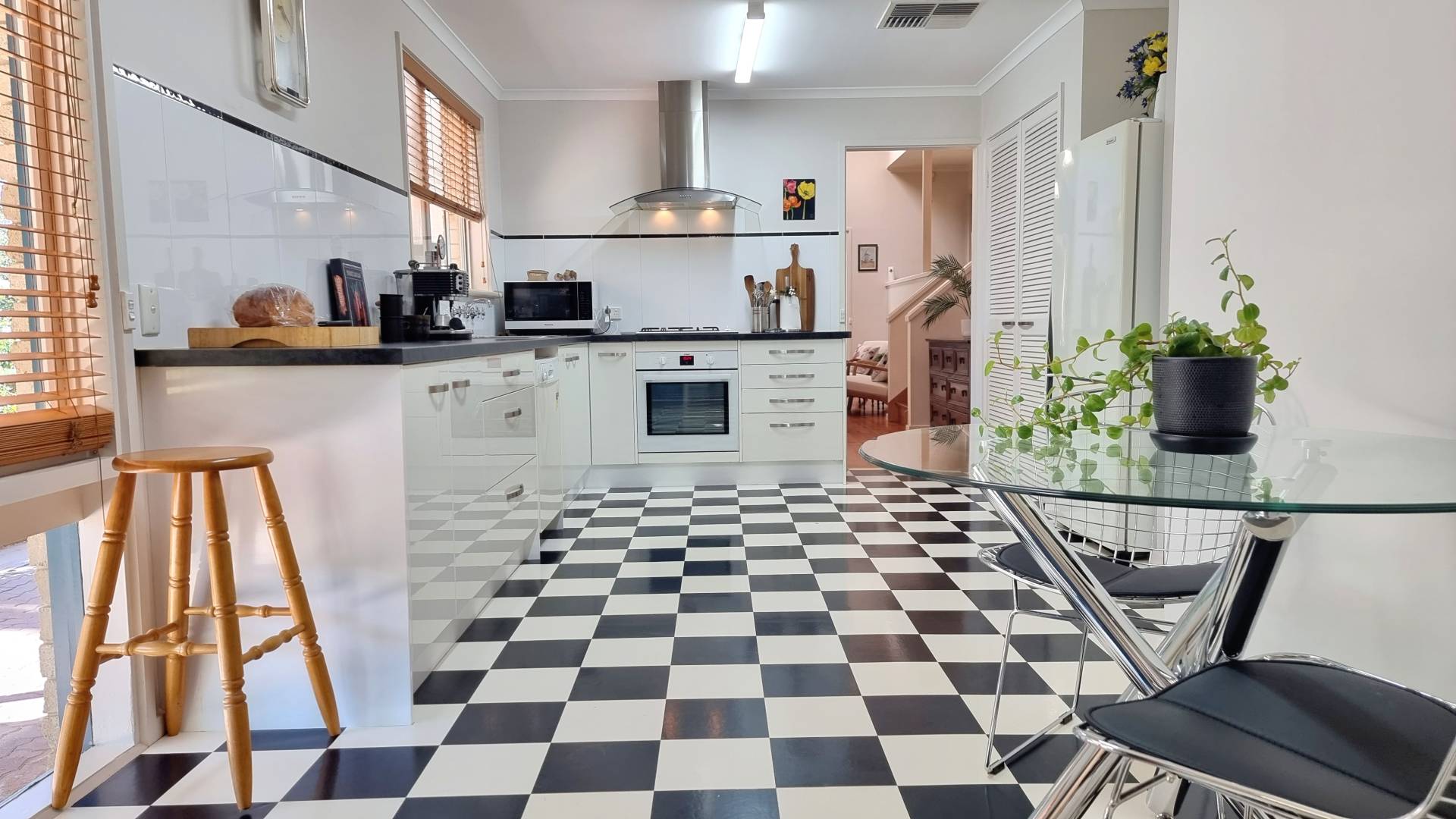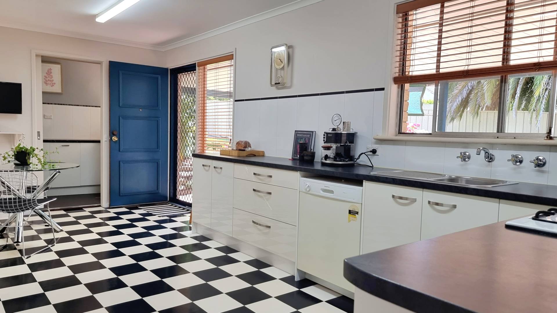Inside, there's a mix of timber floors, carpet and a love it or loathe it checker board kitchen floor - there's timber floor boards underneath.