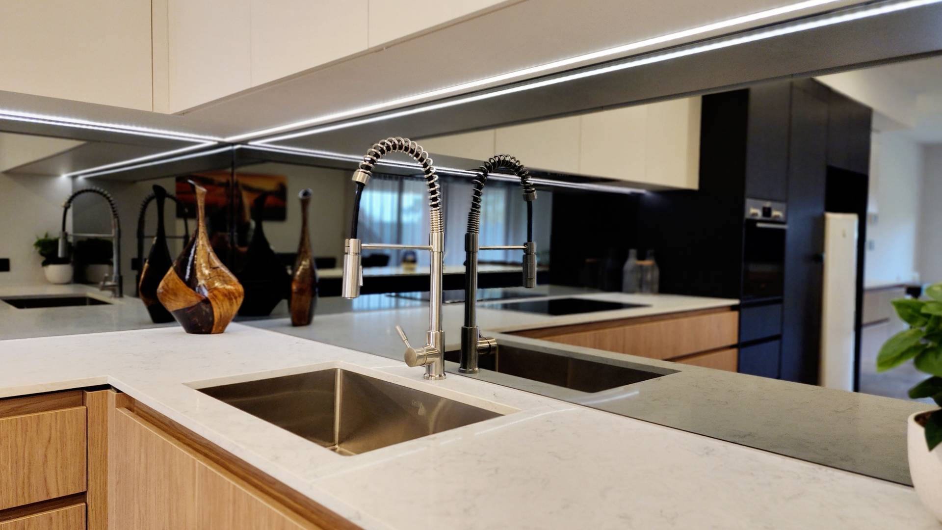 Take your entertaining to the next level in this modern kitchen. The stone topped island bench stands on steel legs, made to look like a piece of furniture and does so, so very well. Mirrored splash back is easier to clean than scrubbing grout lines and creates wonderful depth with its reflections.