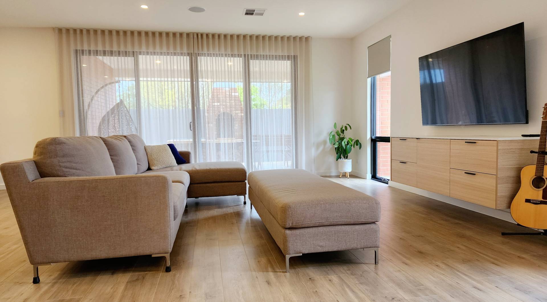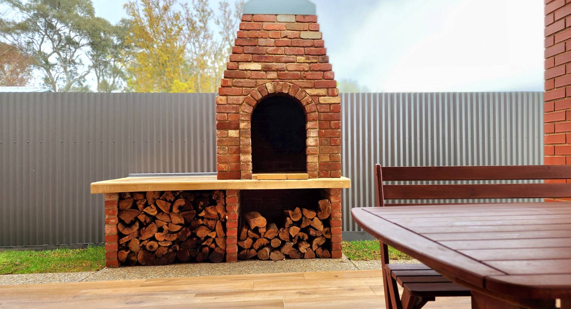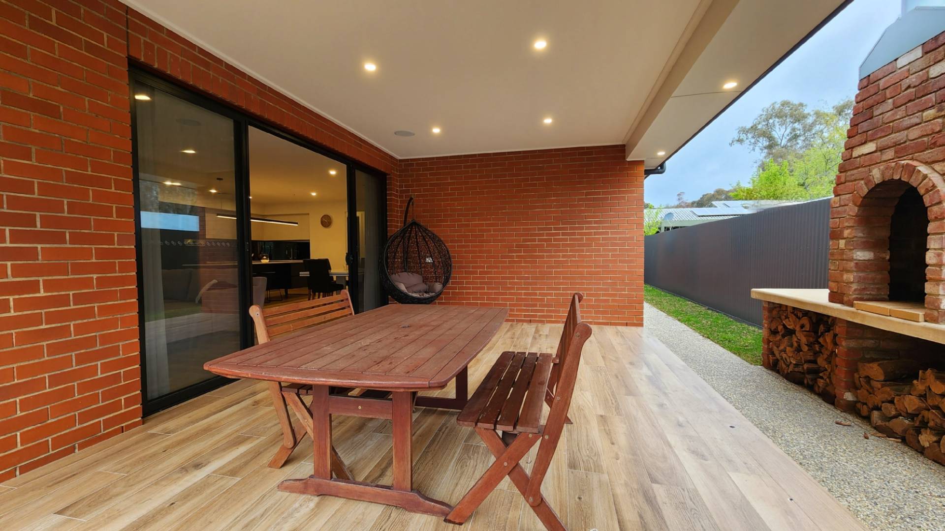 Move the sheer curtains to the side and slide the double doors apart to expand the family room into the outdoor entertaining area, met with a hand built reclaimed brick pizza oven with wood store.