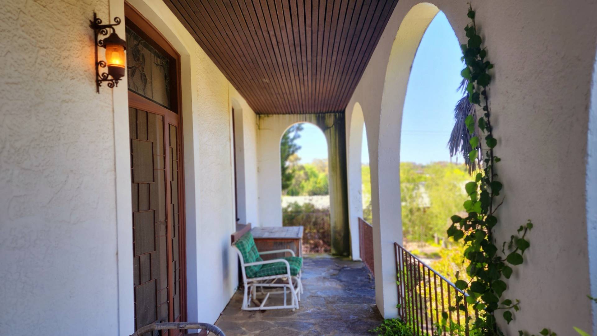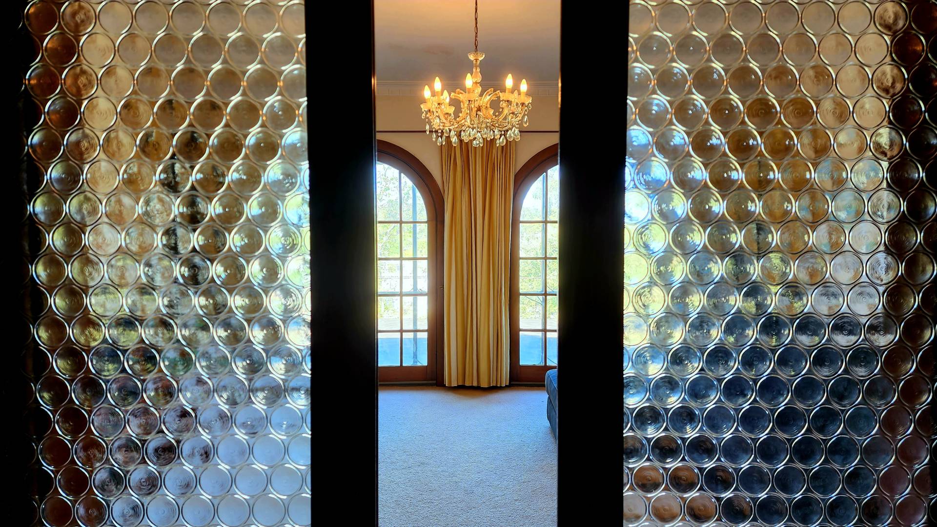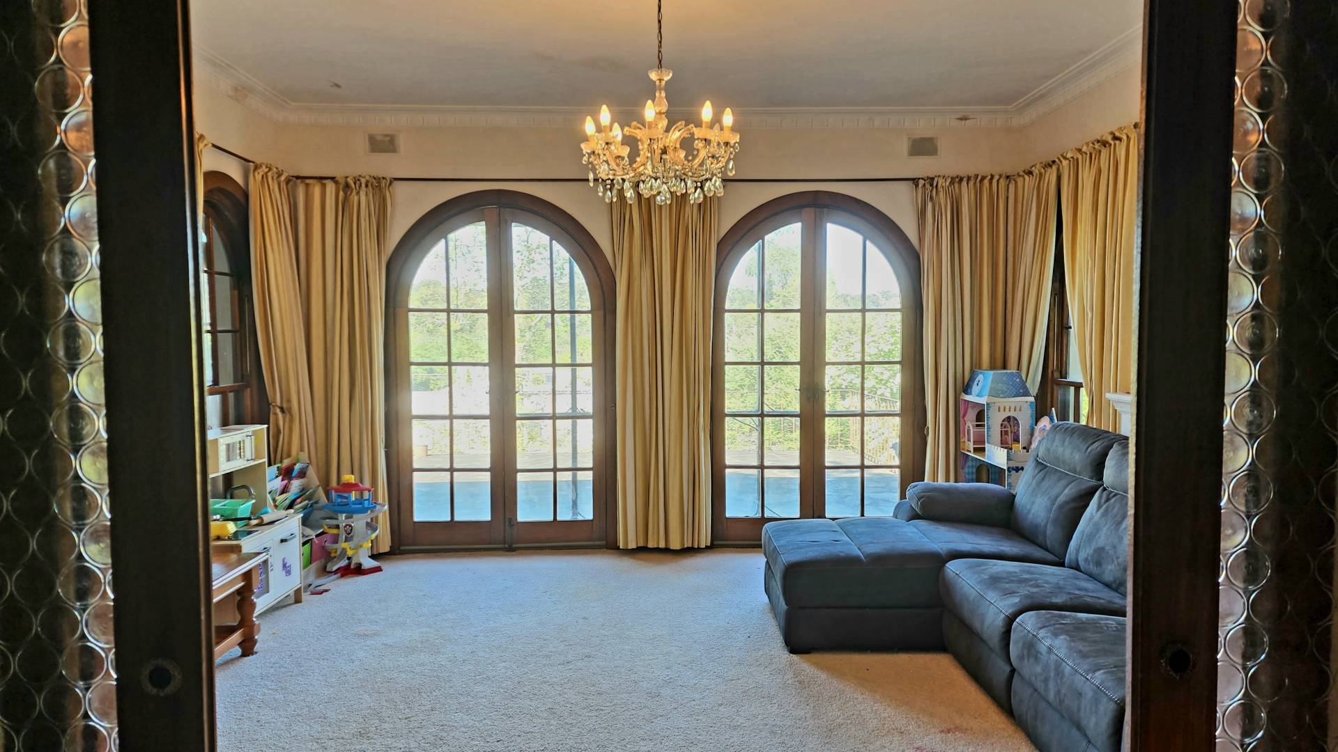 50years later, in 1970 the home was sold to the family who still own it today, where it underwent an enormous extension at that time. This era brought about Spanish inspiration, where inside ornate cornices meet the high ceilings, there's chandeliers, retro sliding glass doors dividing living rooms, an indoor/outdoor sunroom with ceiling clad in timber panelling. There's sash windows and French doors in curved arches and timber floorboards under the carpet, all still in original condition today.