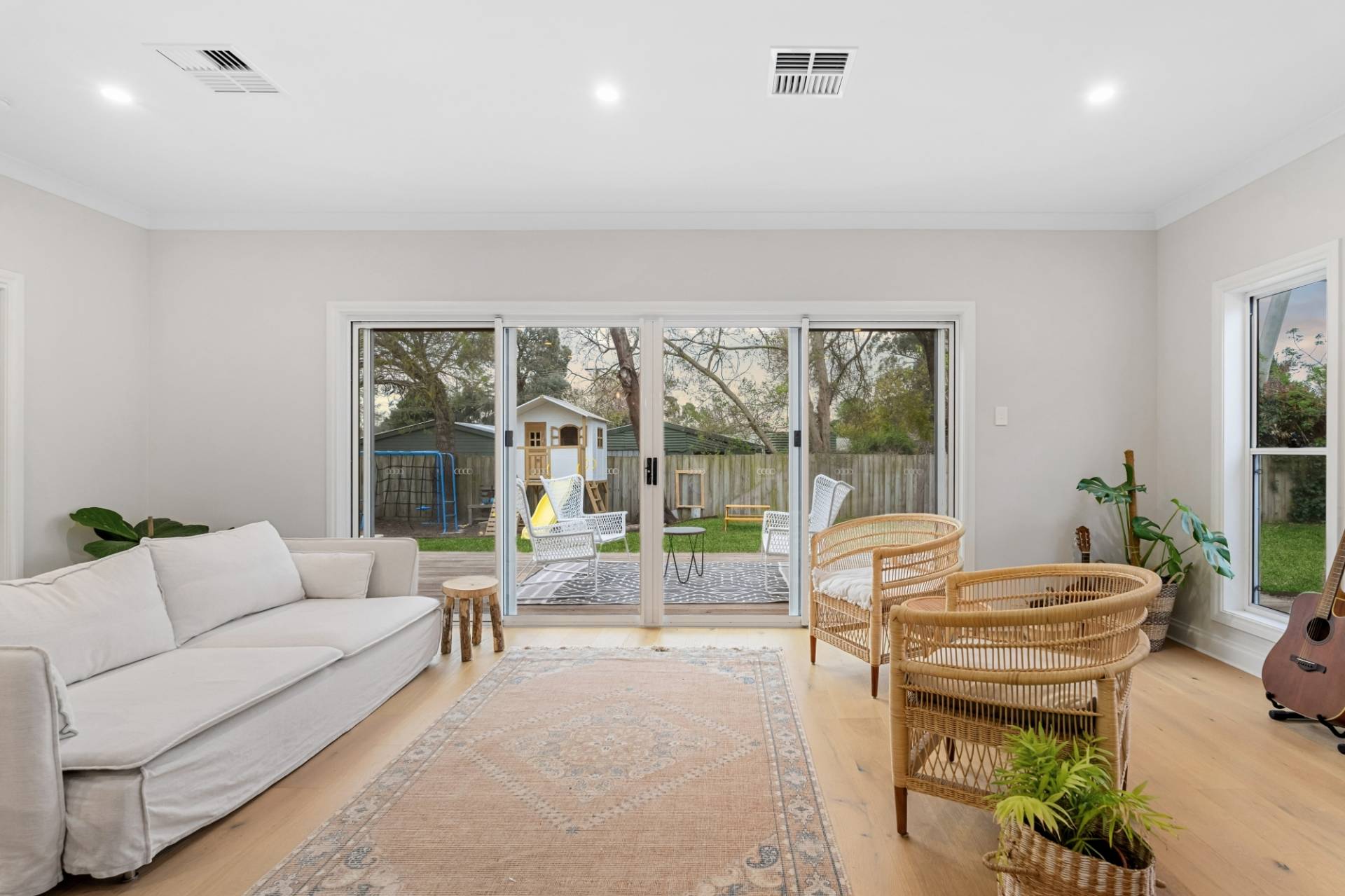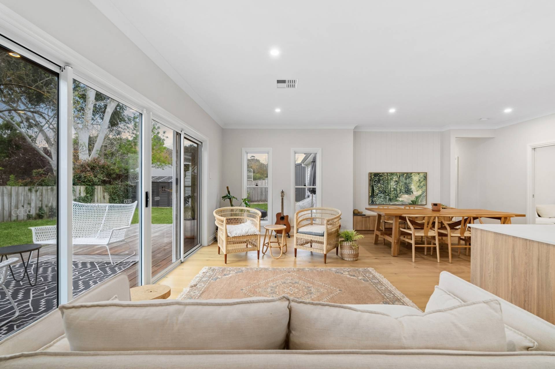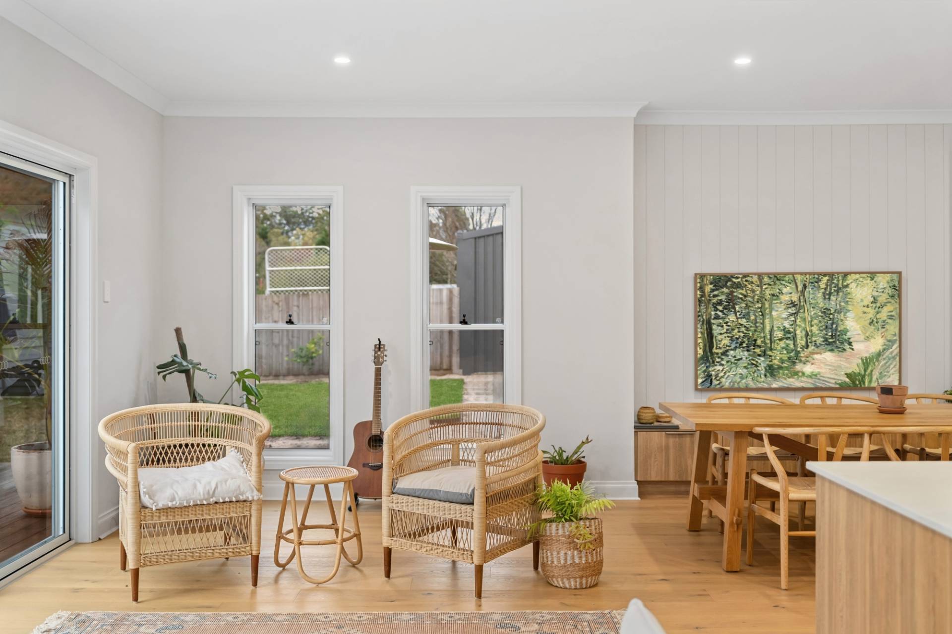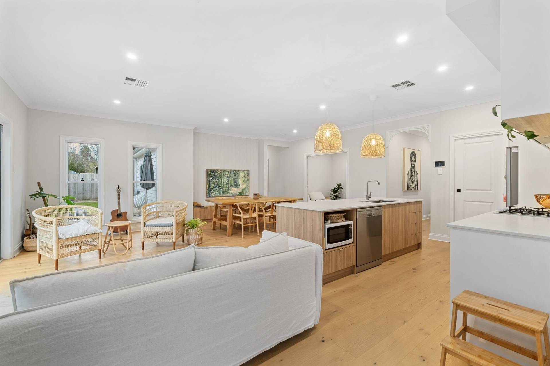 Shift the white sliding doors apart and step onto the sun-soaked deck, welcoming you onto a sprawling flat lawn, ready to host long lunches, entertaining evenings, children's play or that perfect spot for some peace and quiet. Bordered by stunning mature trees, a shiplap timber fence and new fruit trees growing, its' a very serene and universal backyard.