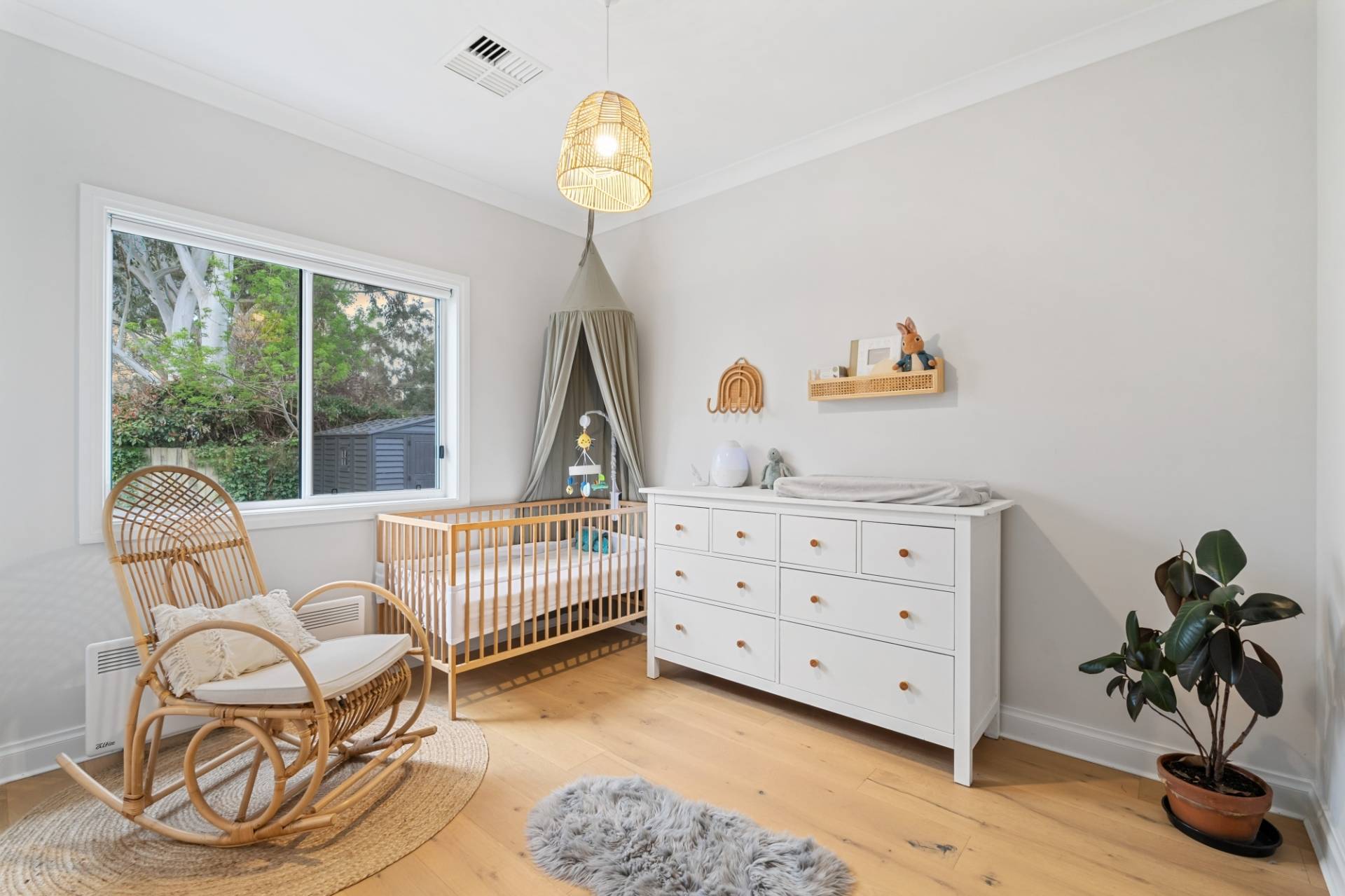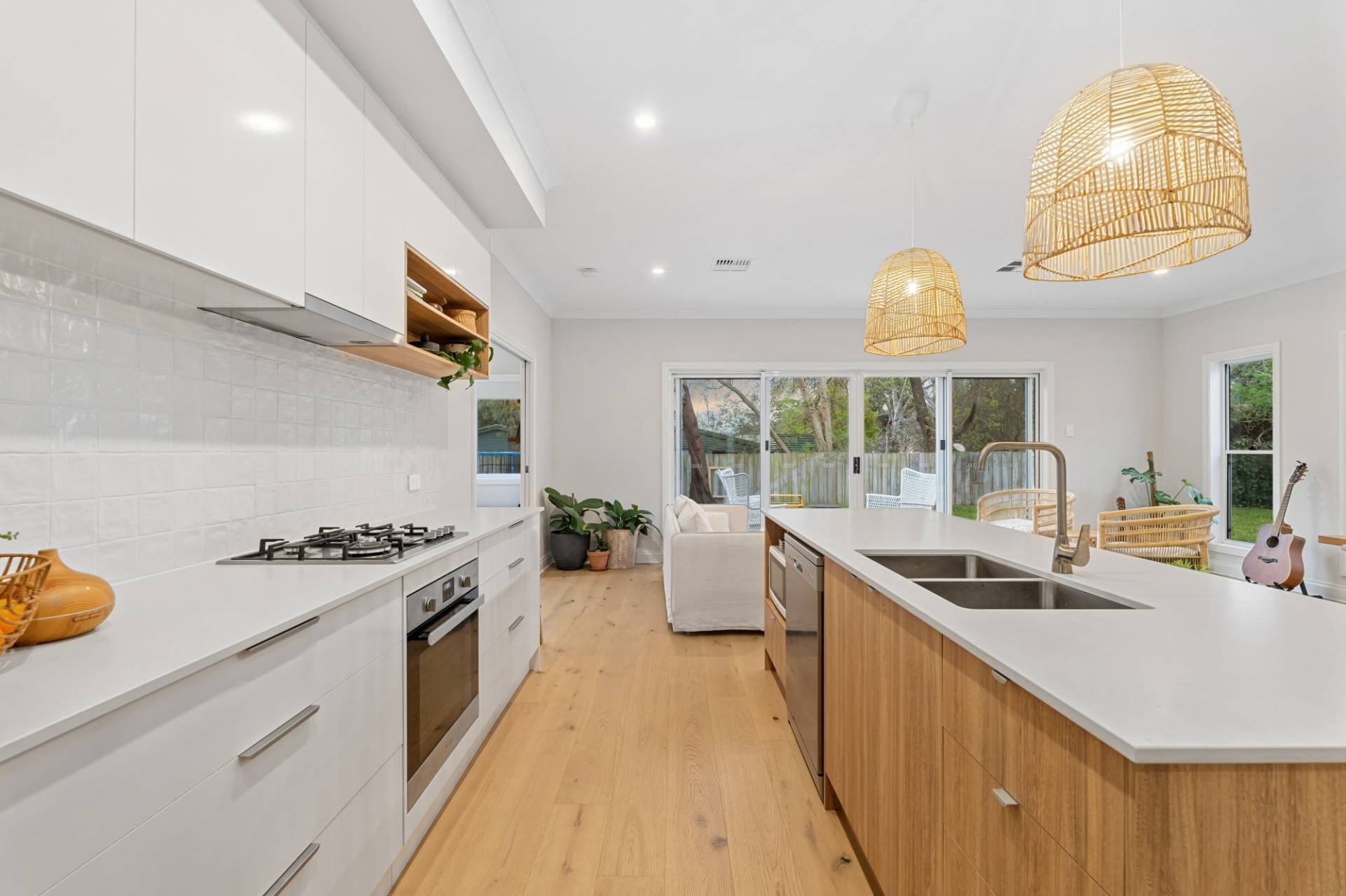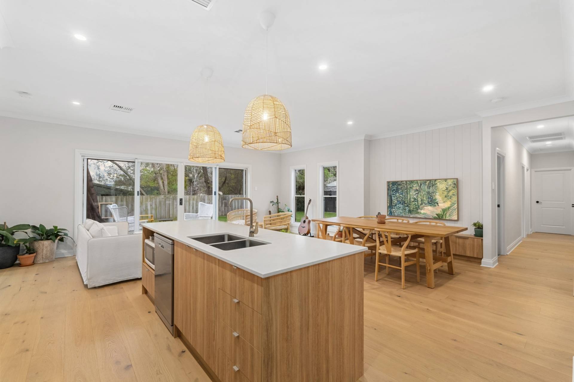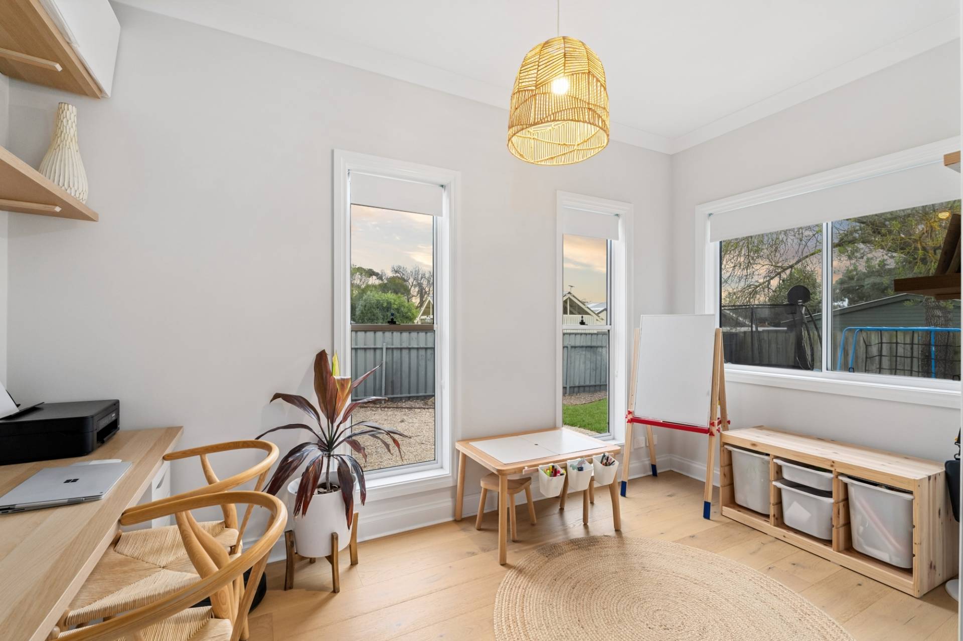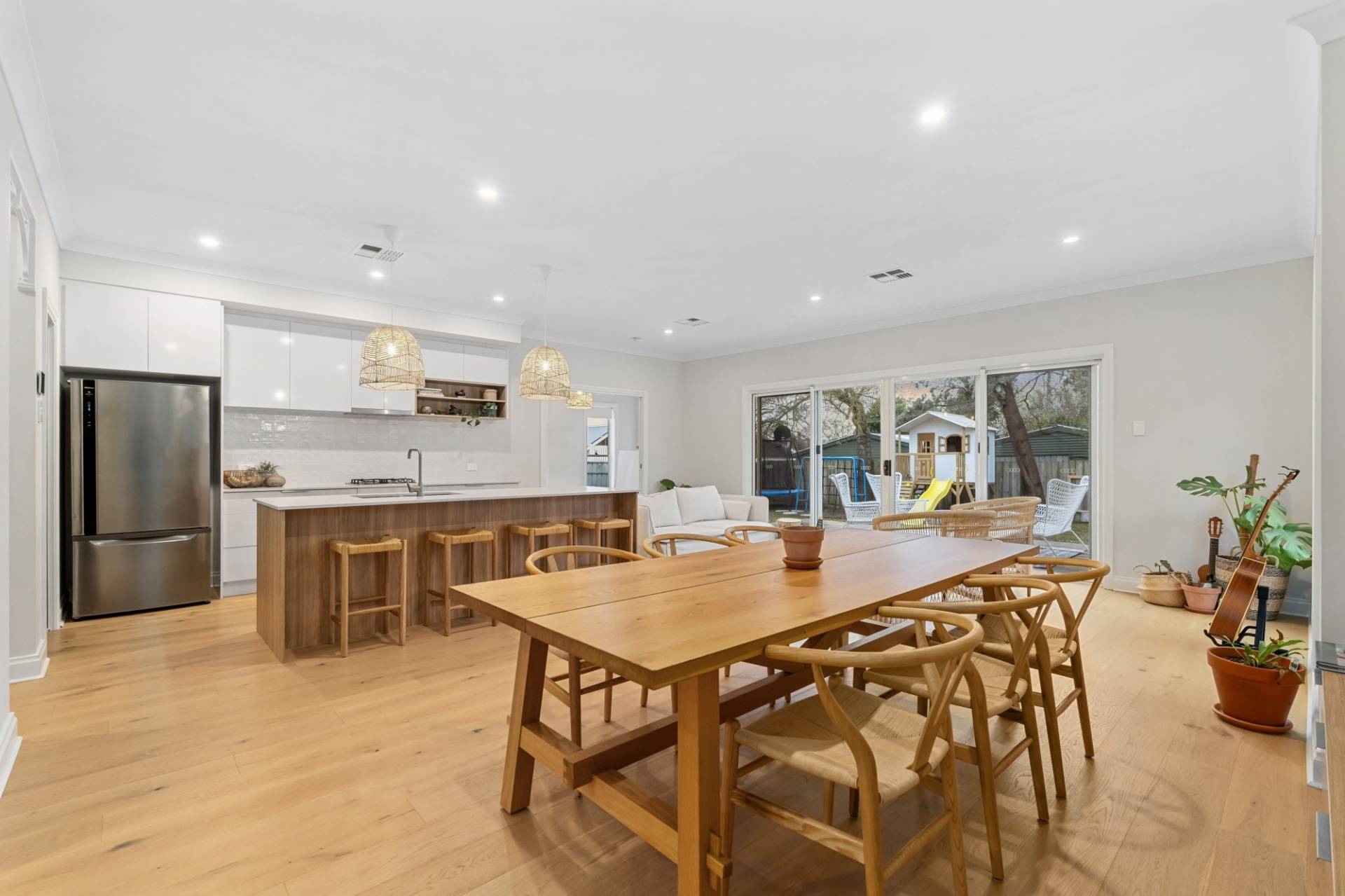 Shift the white sliding doors apart and step onto the sun-soaked deck, welcoming you onto a sprawling flat lawn, ready to host long lunches, entertaining evenings, children's play or that perfect spot for some peace and quiet. Bordered by stunning mature trees, a shiplap timber fence and new fruit trees growing, its' a very serene and universal backyard.