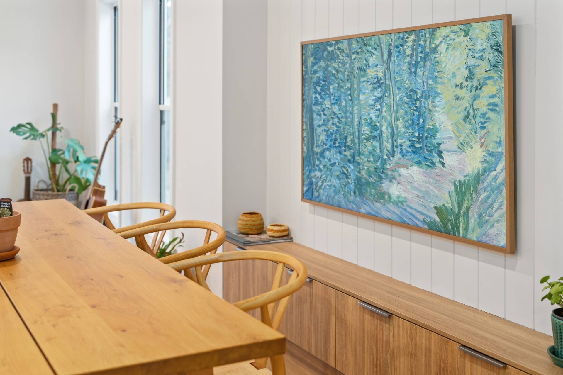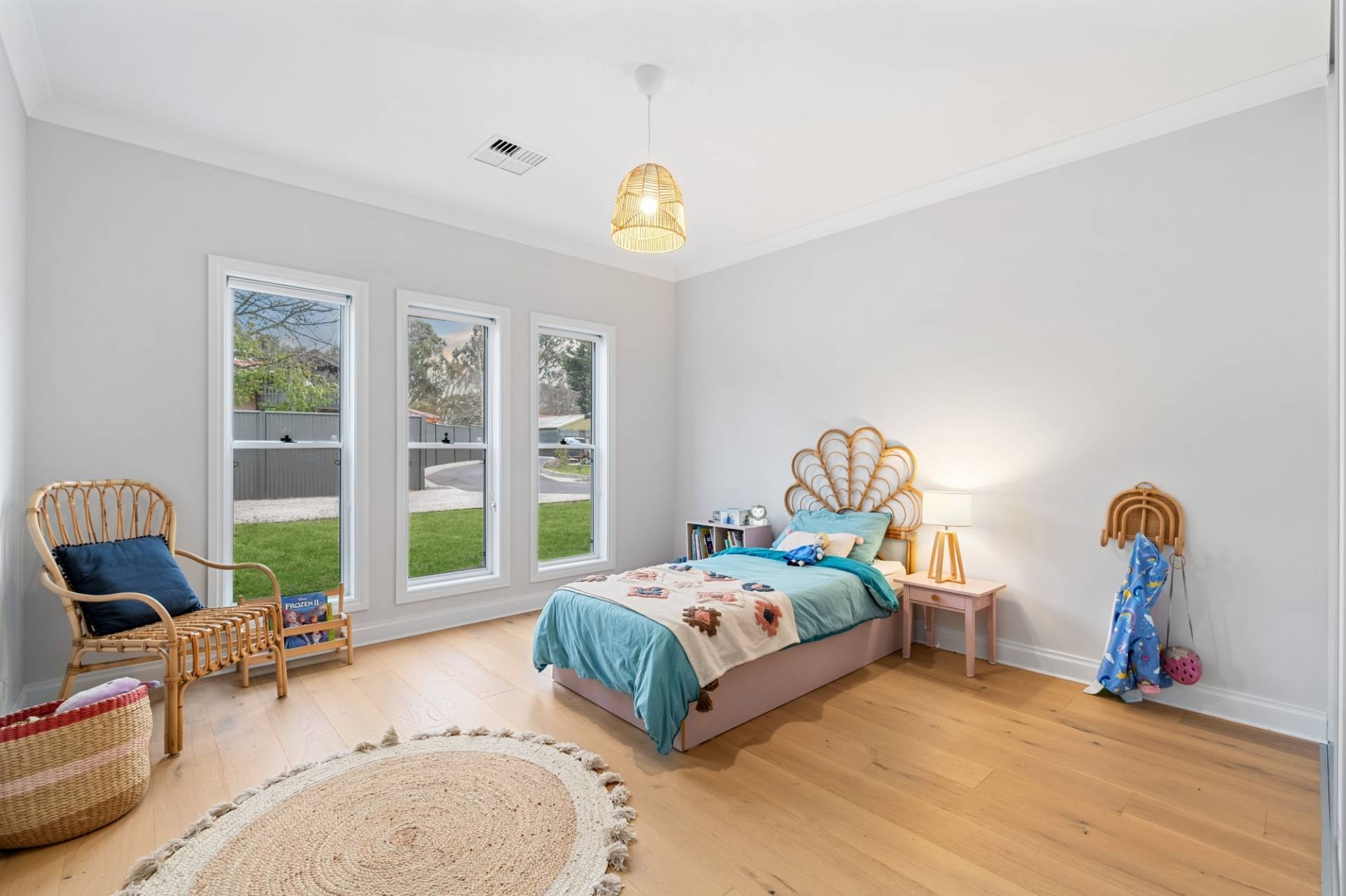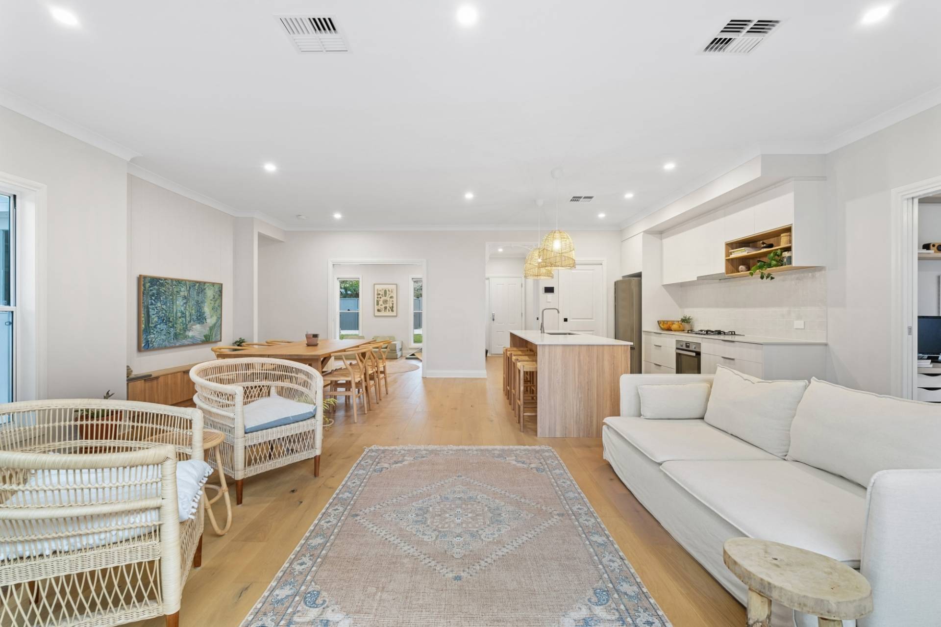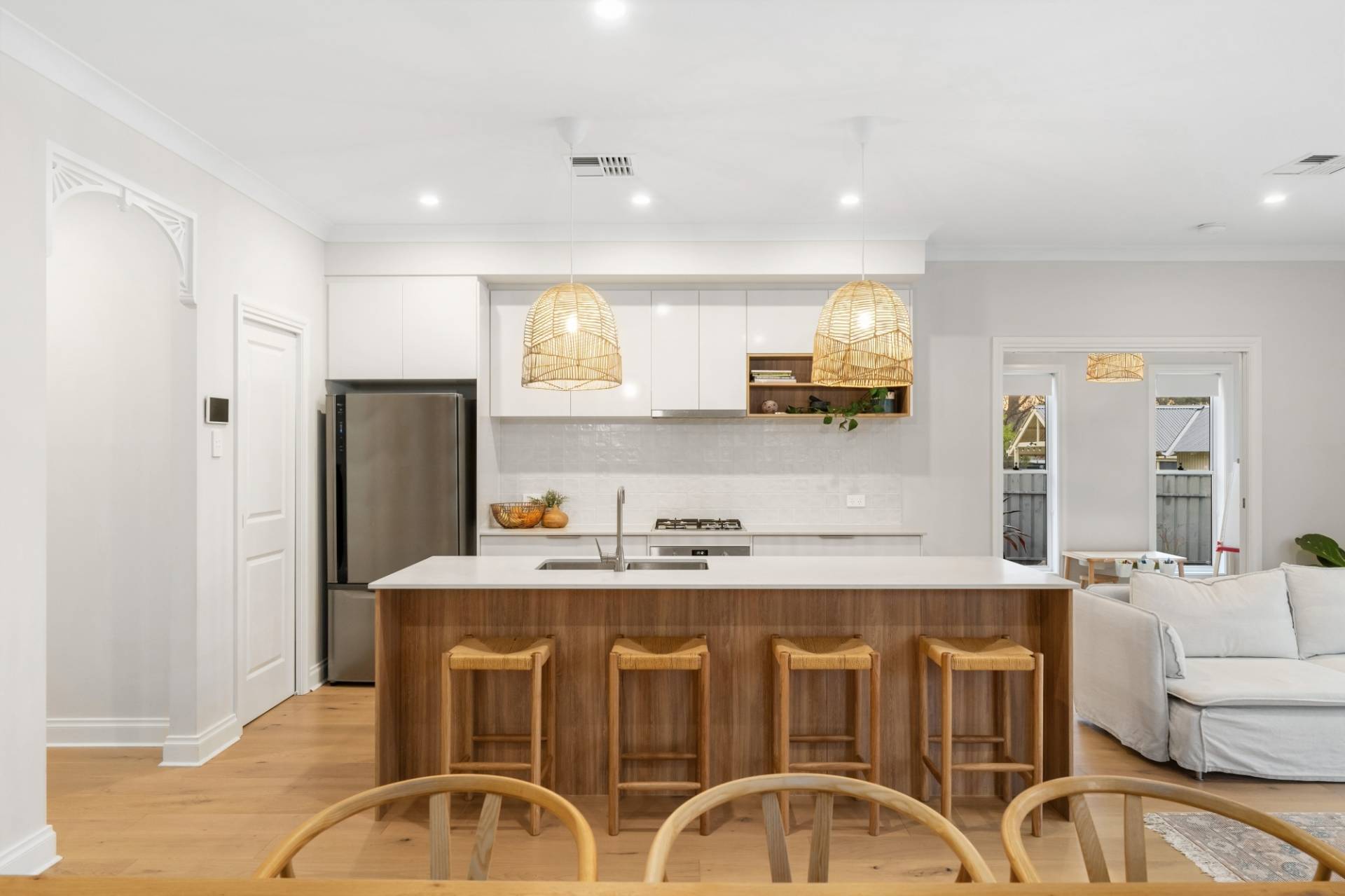 Shift the white sliding doors apart and step onto the sun-soaked deck, welcoming you onto a sprawling flat lawn, ready to host long lunches, entertaining evenings, children's play or that perfect spot for some peace and quiet. Bordered by stunning mature trees, a shiplap timber fence and new fruit trees growing, its' a very serene and universal backyard.
