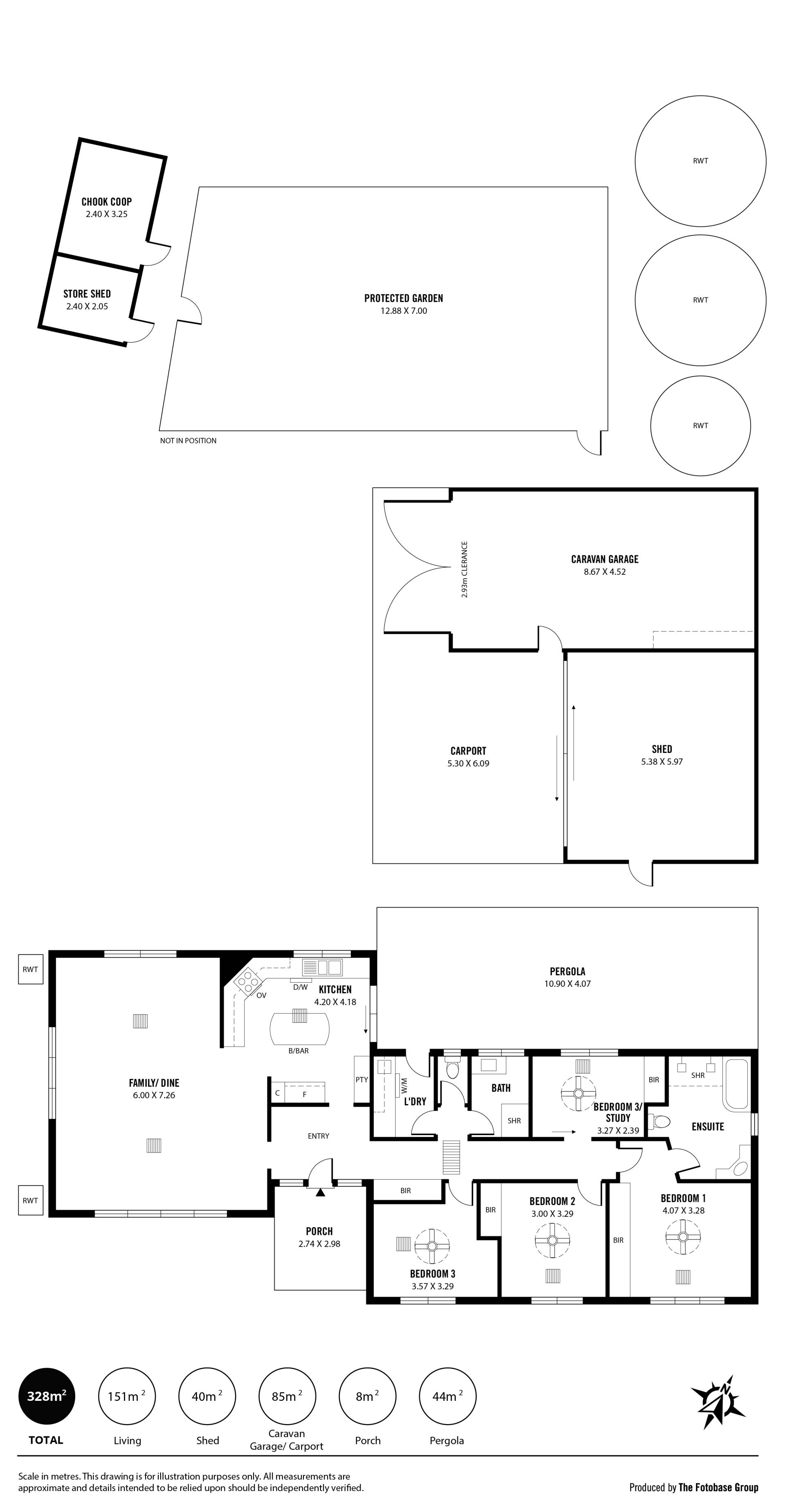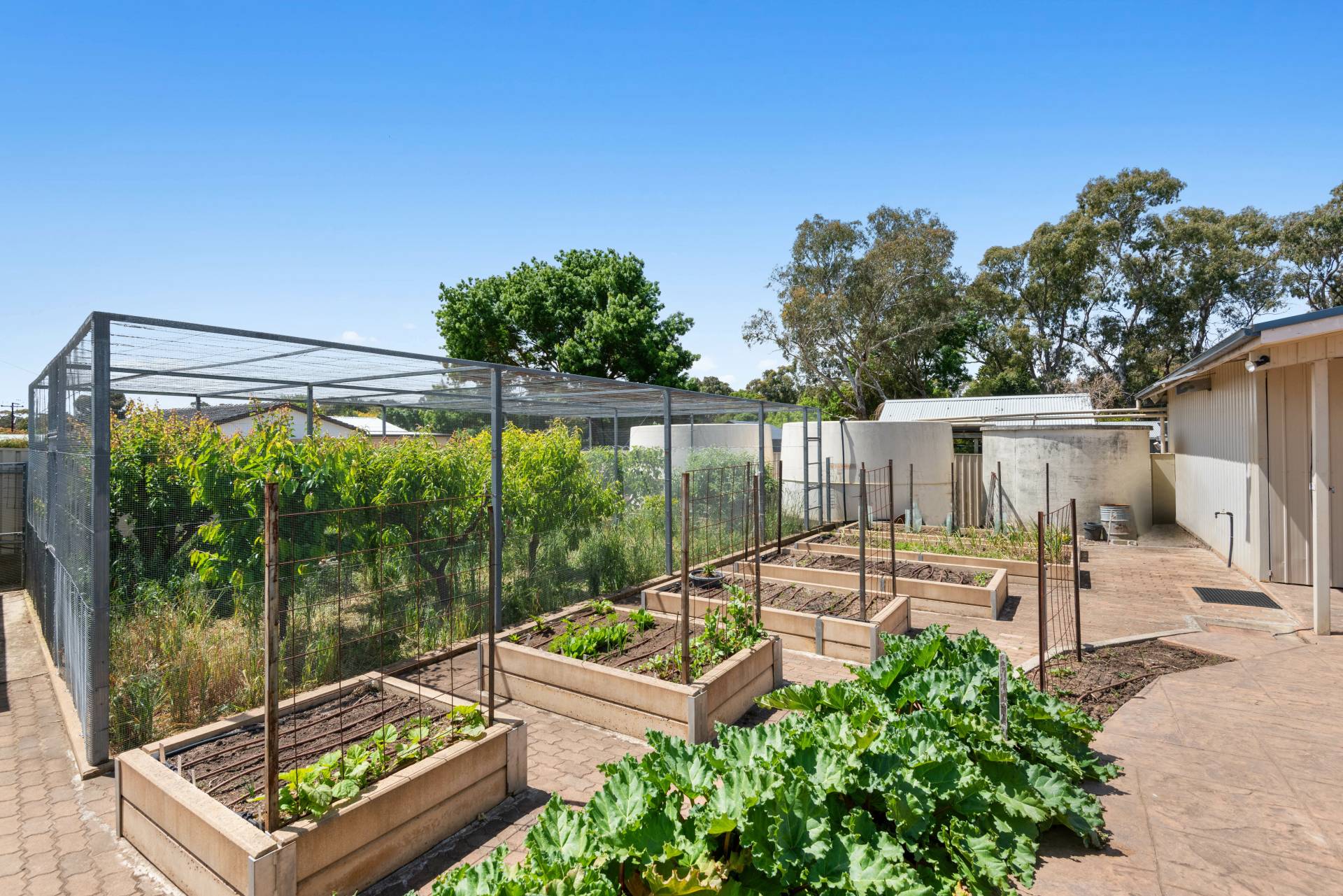 The irrigated fruit tree orchard is protected by bird wire, being 12.8m x 7m in size, where the chickens run below eating the sown oats. Raised vegetable beds are also on a timed irrigation system, which can be controlled individually to water any particular one or all of choice.