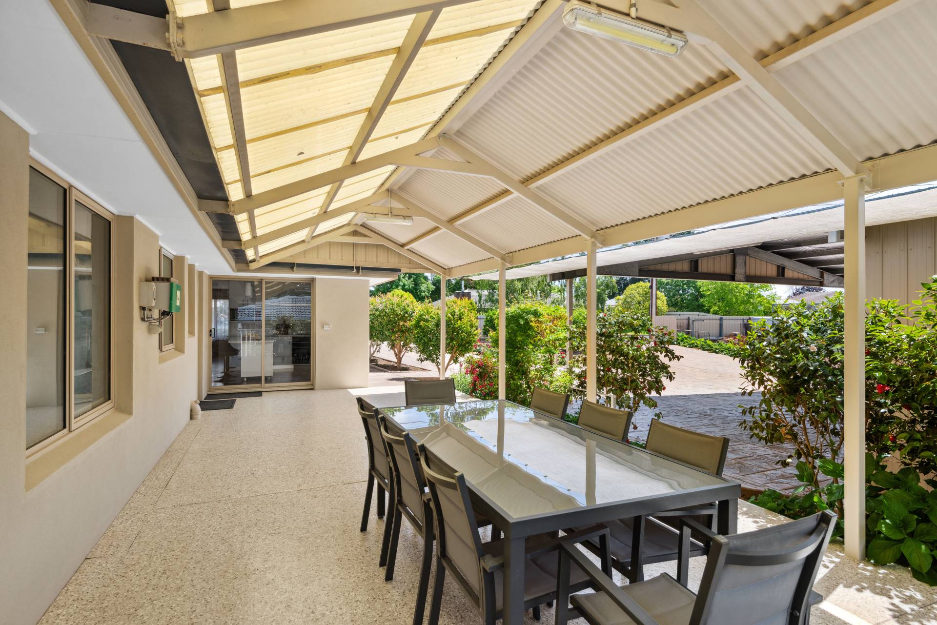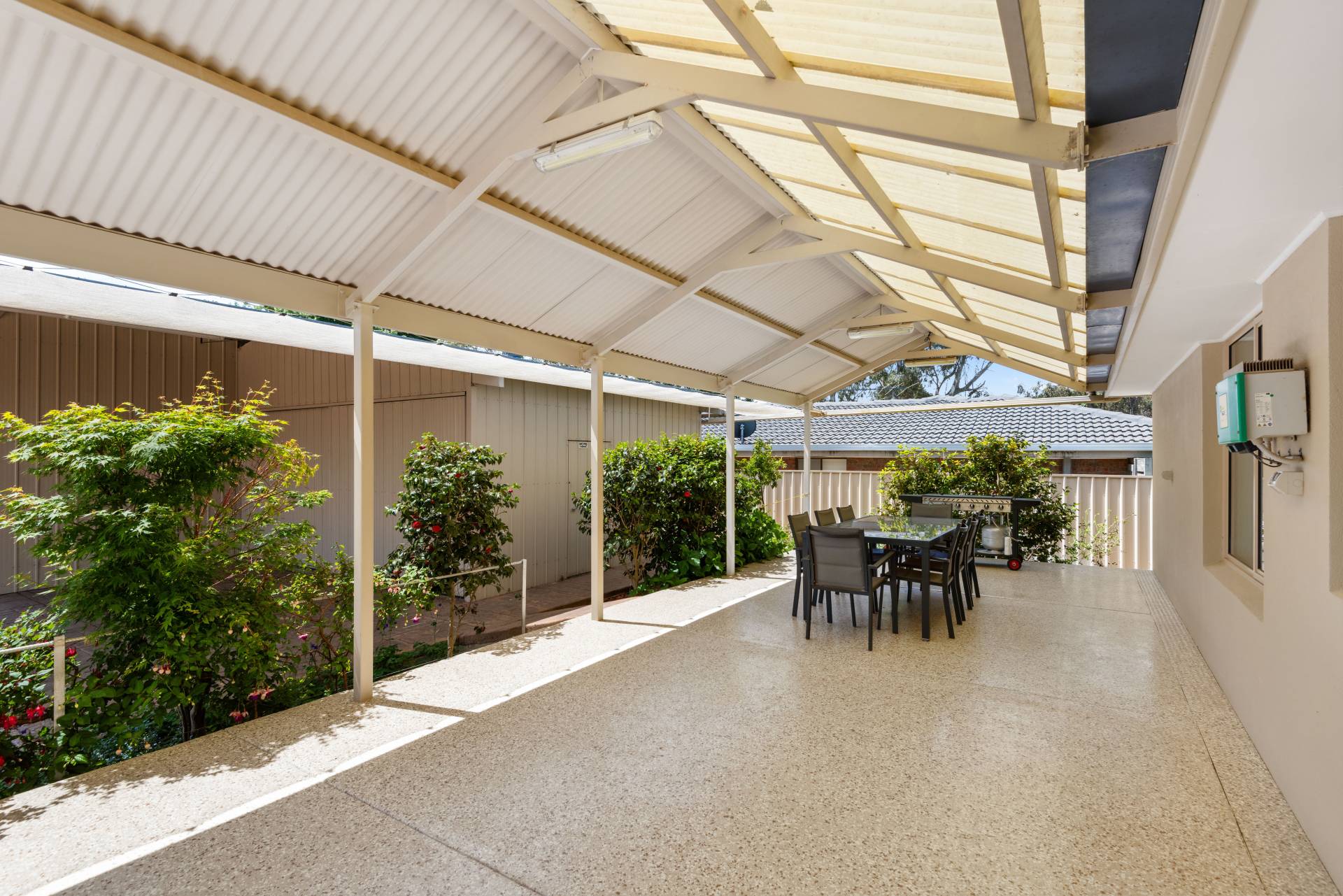 A floral arrangement of hydrangeas, camelias and fuchsias line the large, pitched roof pergola, an ideal place to gather friends and family.