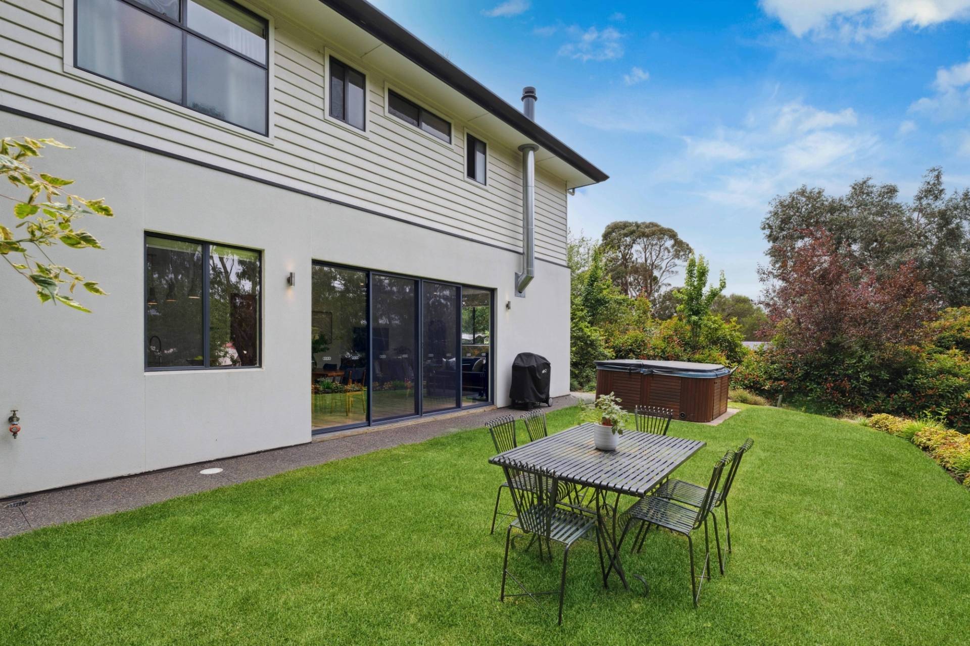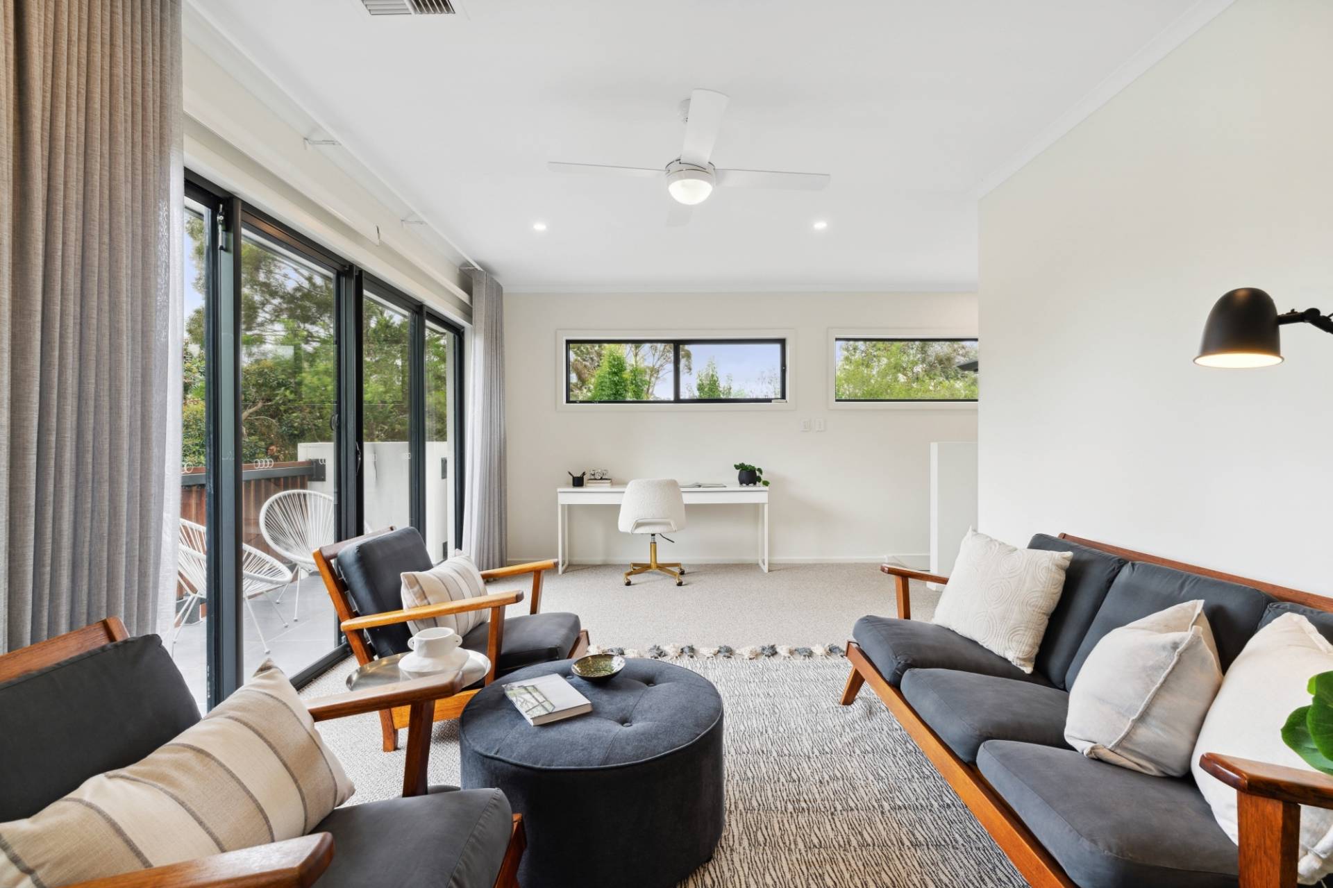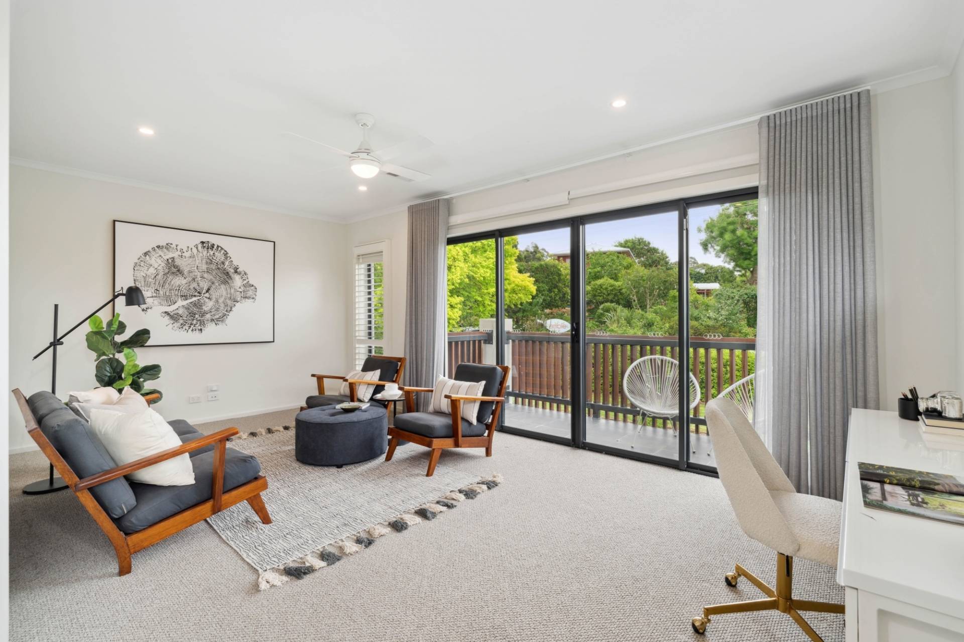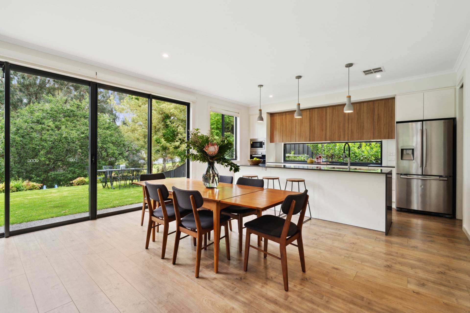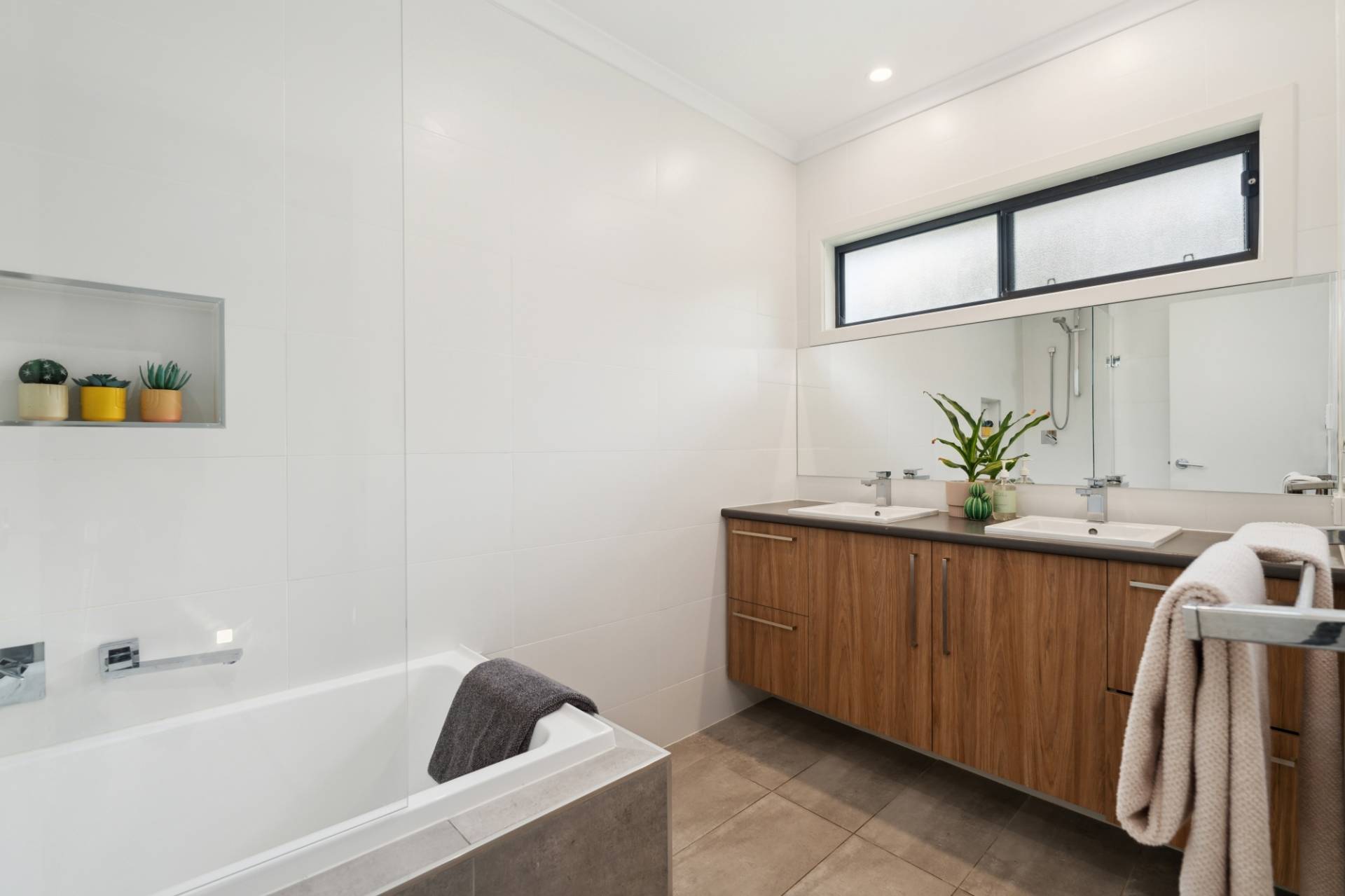 Exposed aggregate driveway and exterior perimeter paths nod to the high-end features to be found inside. And it doesn't take long to find them... Through the front door and we experience a show home feel. Ground floor level sees 9ft ceilings, wide timber composite boards underfoot and windows capturing leafy views at every opportunity, this is certainly a pleasurable place to call home.
