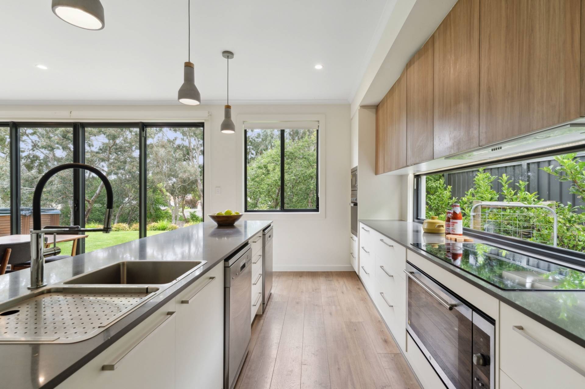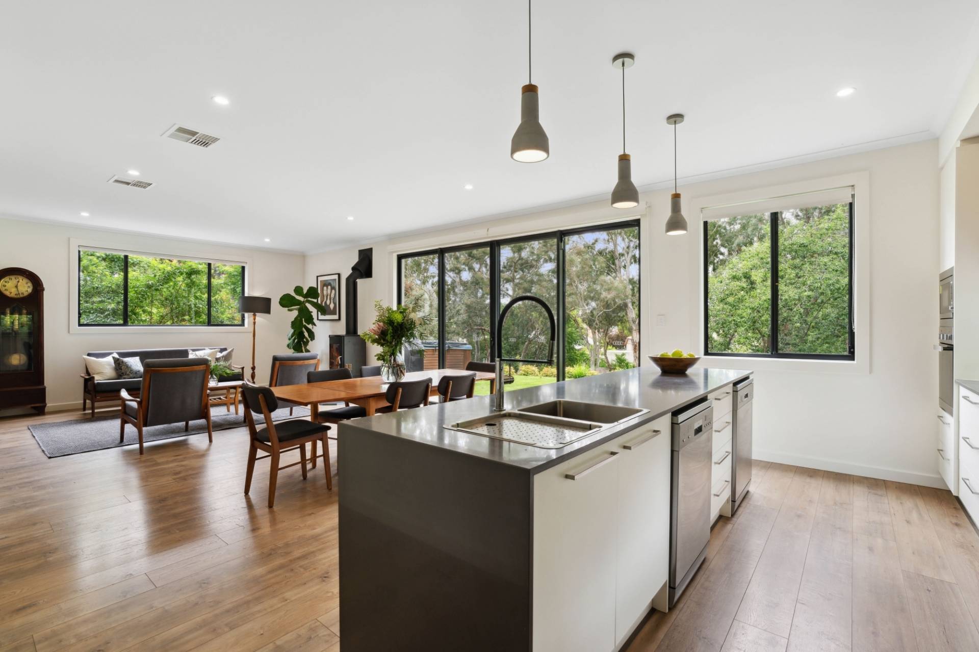 The showstopper is the open plan kitchen, living, dining area, where the Nectre wood fire roars, stunning treed vistas are like canvas's on every wall and the kitchen, with stone tops, double ovens, double dishwashers and enormous walk-in pantry leaves little more to want.