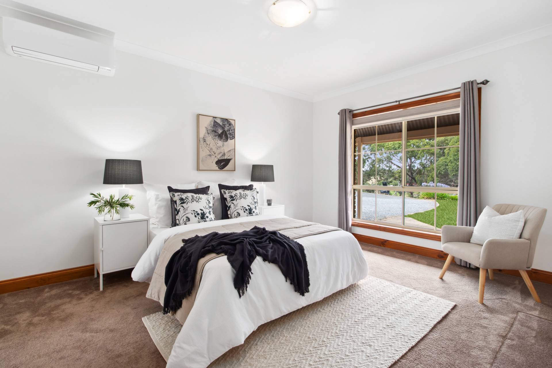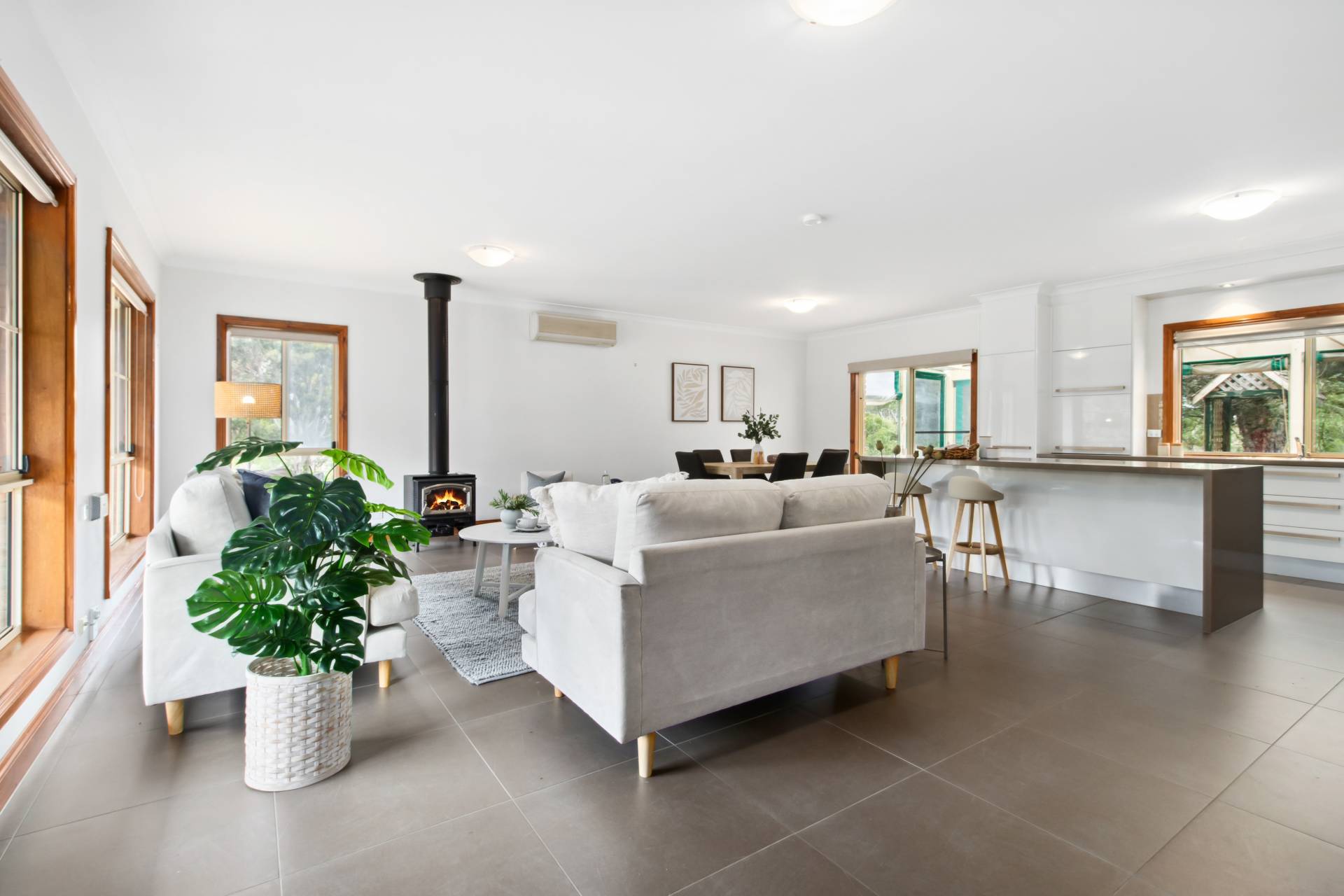 The prettiest of outlooks from every window, the open plan living space brings views of the outdoors in. A Lopi combustion heater adds warmth and charm and when required and there's 3 R/C split systems in the home for instant cooling or heating.
