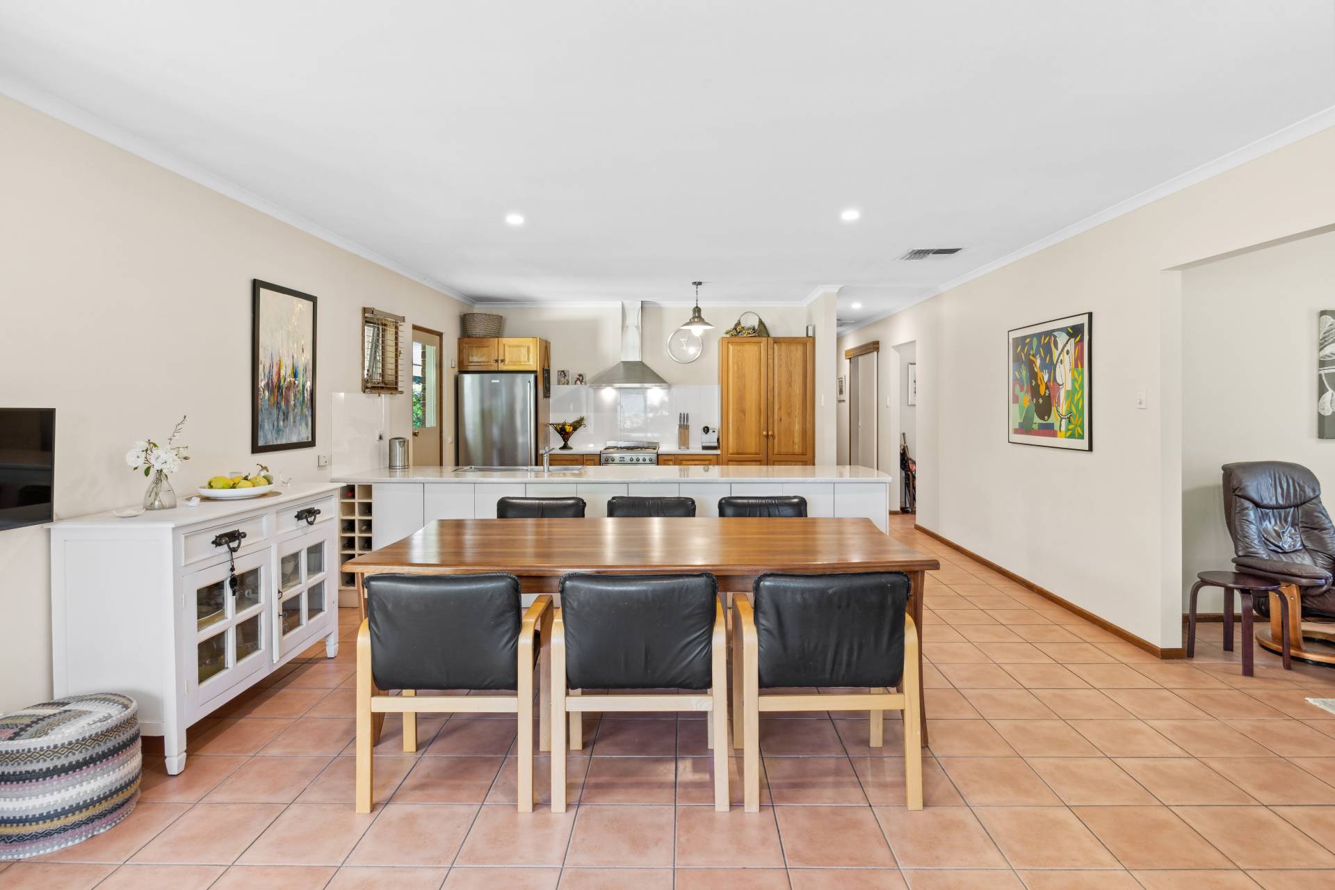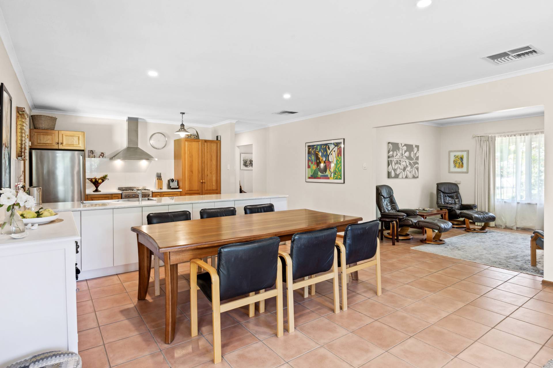 A renovation saw an internal wall removed and now opens the kitchen into a big, open plan dining/living area, under 2.7m ceilings, where light floods through multiple windows and French doors lead to an alfresco entertaining area under pitched roof.