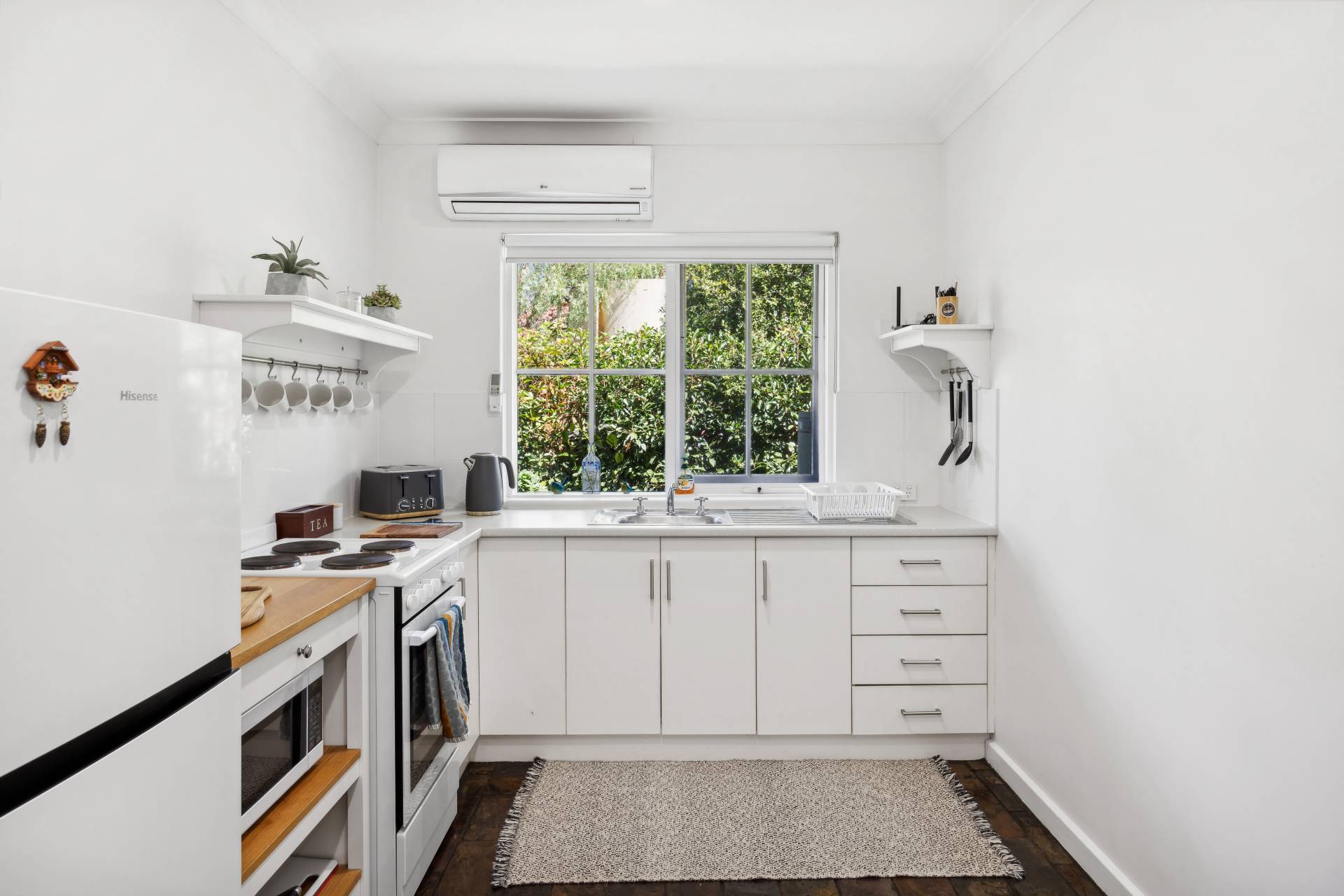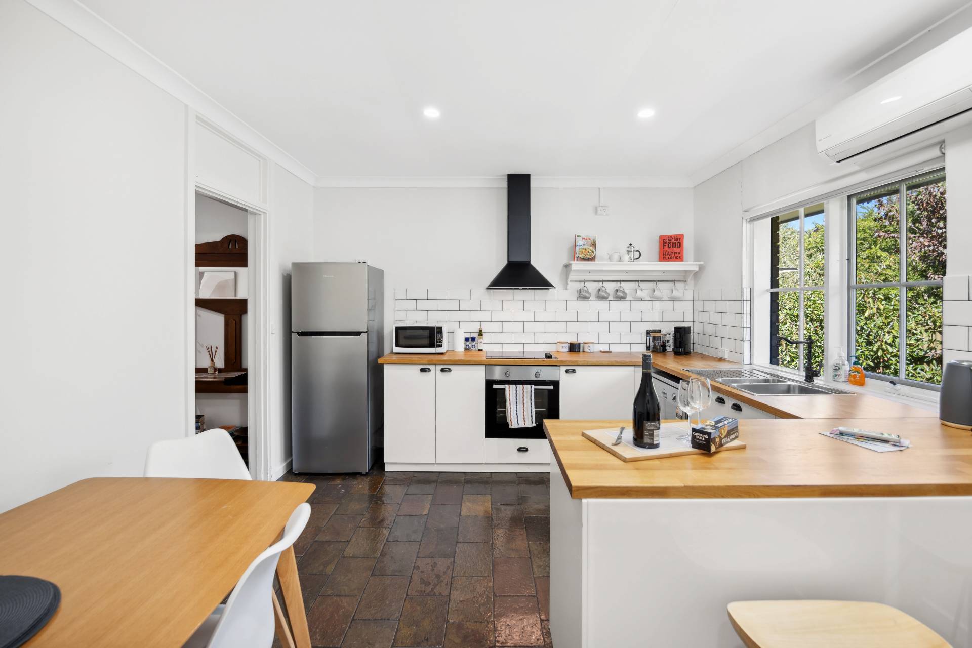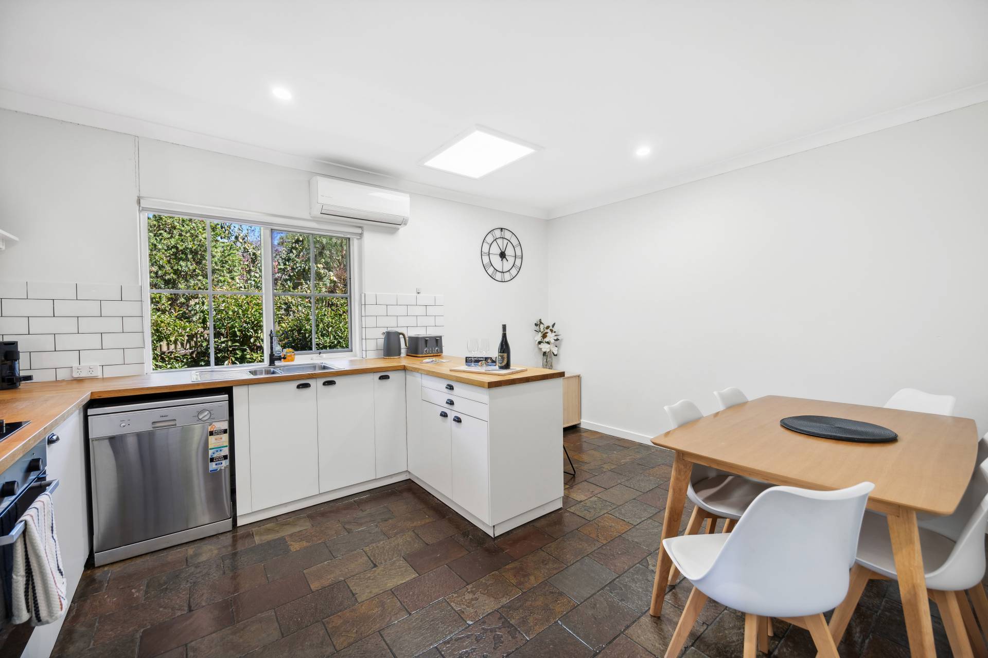 The recently installed larger kitchen, with timber tops and new appliances looks sharp and inviting over a polished slate tiled floor.