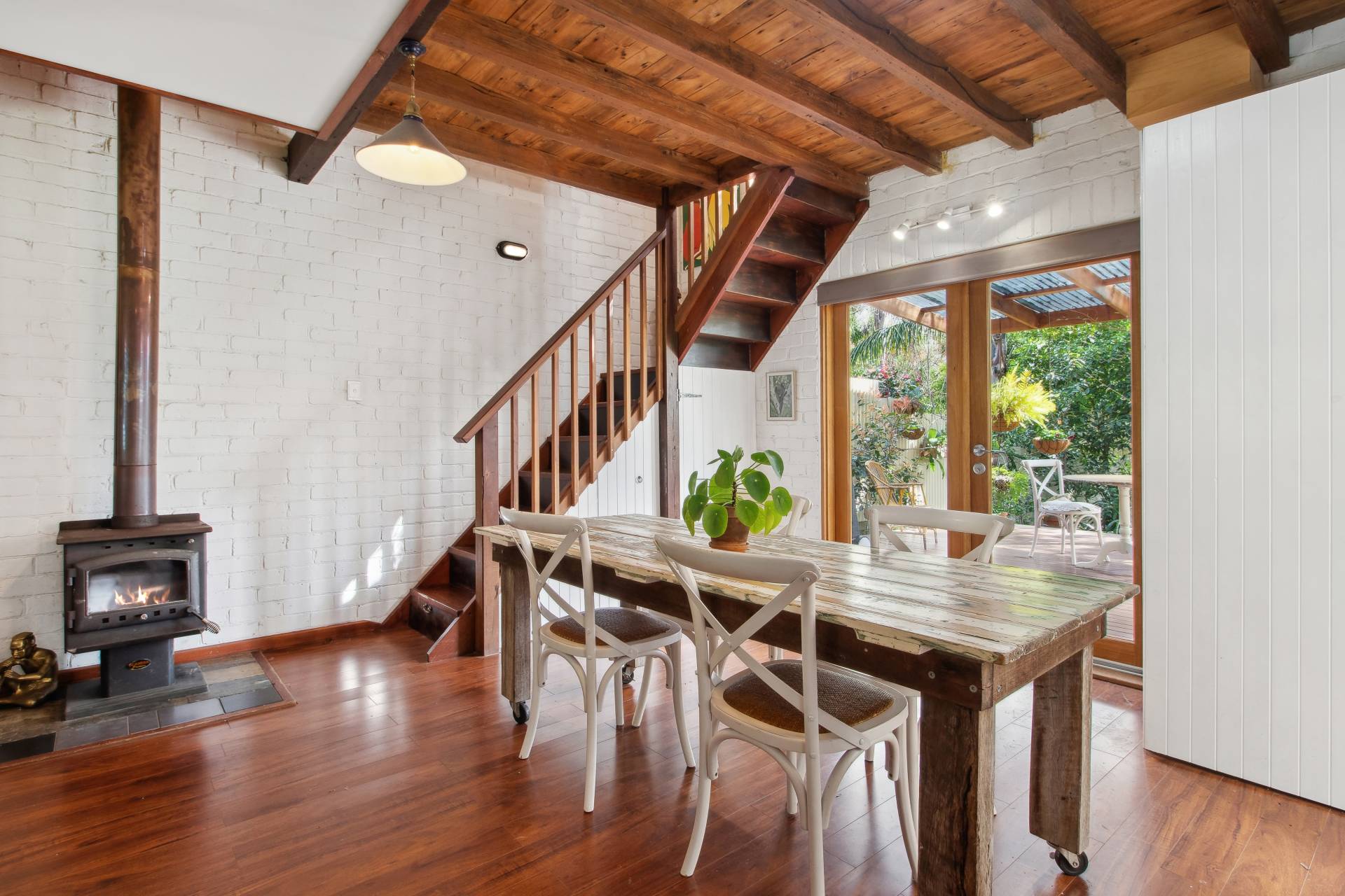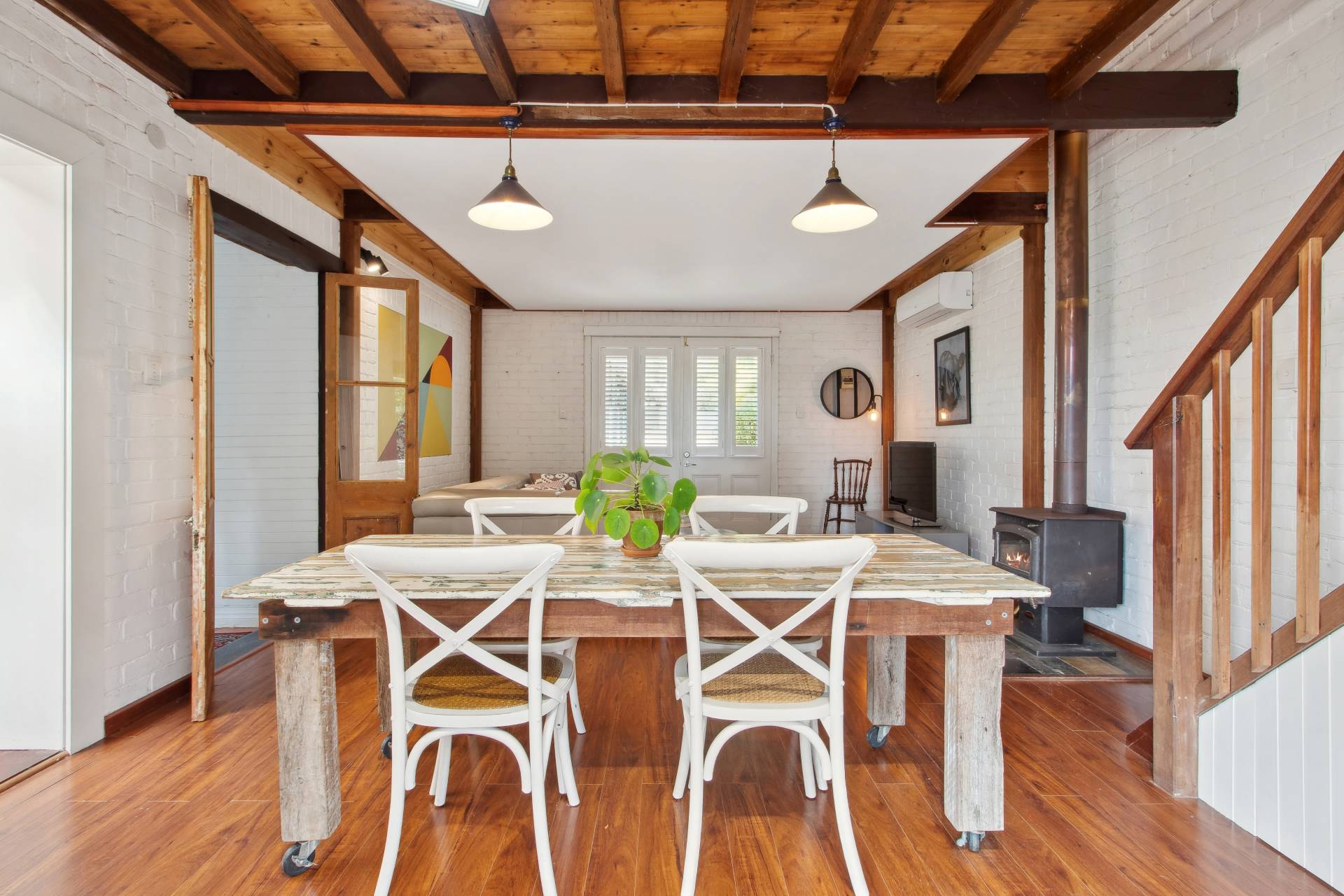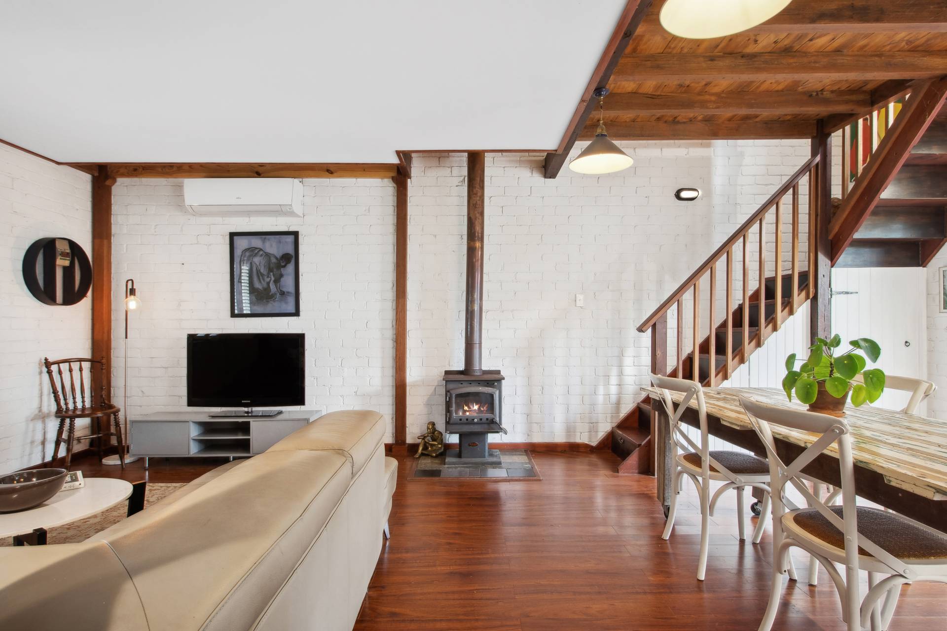 Reminiscent of a quaint English cottage, hints of industrial architecture peek through, with exposed red brick walls, solid Jarrah beams, and soaring ceilings, where skylights beam sunrays into the spaces below. For a modest footprint, this home packs a mighty punch, with ample room to host gatherings around the dining table, sprawling into a large living area next to a wood fire. The most beautiful loft bedroom is upstairs with its' own bathroom and downstairs is bedroom #2 with built in robes, adjacent to the second bathroom with baby bath.